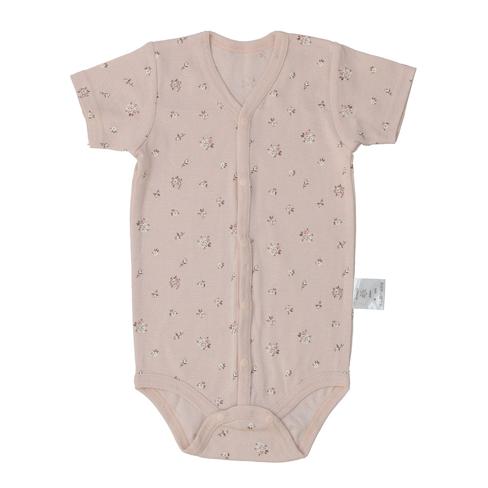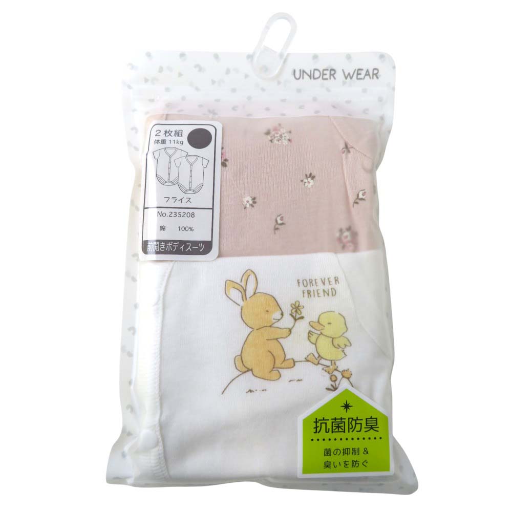 ベビー 綿100%フライス 総柄&ワンポイント 2枚組前開き半袖ボディスーツ