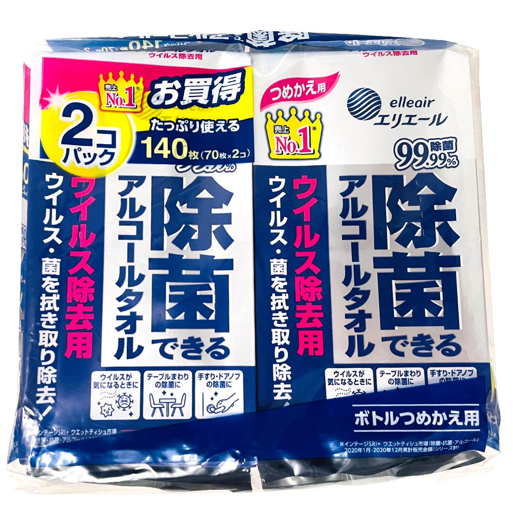 エリエール 除菌できるアルコールタオル ウイルス除去用 つめかえ用 70枚×2個入