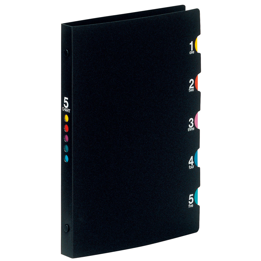 表紙に1~5までの半円状のカットがあり、そこからインデックスが覗いているところがオシャレで特長的なバインダーです。