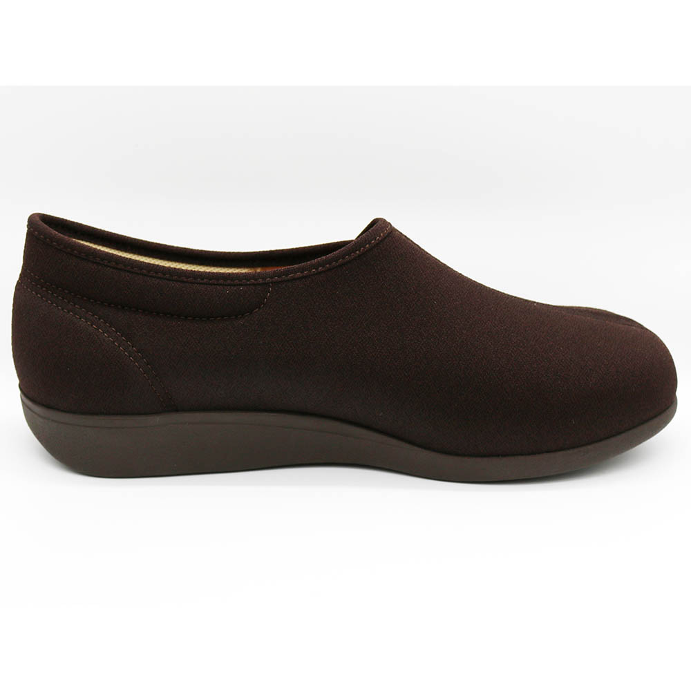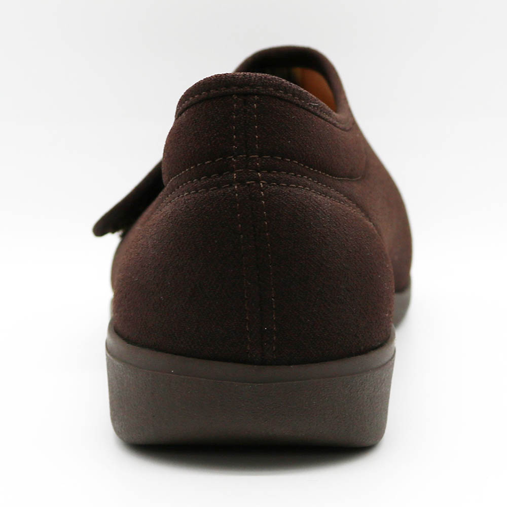 面ファスナーが大きく開き、脱ぎ履きしやすいシューズ。ひざの負担を軽減し、体重移動をスムーズにする「フットオンコントローラーシステム」を採用。軽量であり、つま先と踵を巻き上げることでつまずきを防止できる。安心・安全の国内生産。表面に水を弾く撥水加工及び抗菌・防臭加工つき。幅広4E設計。
