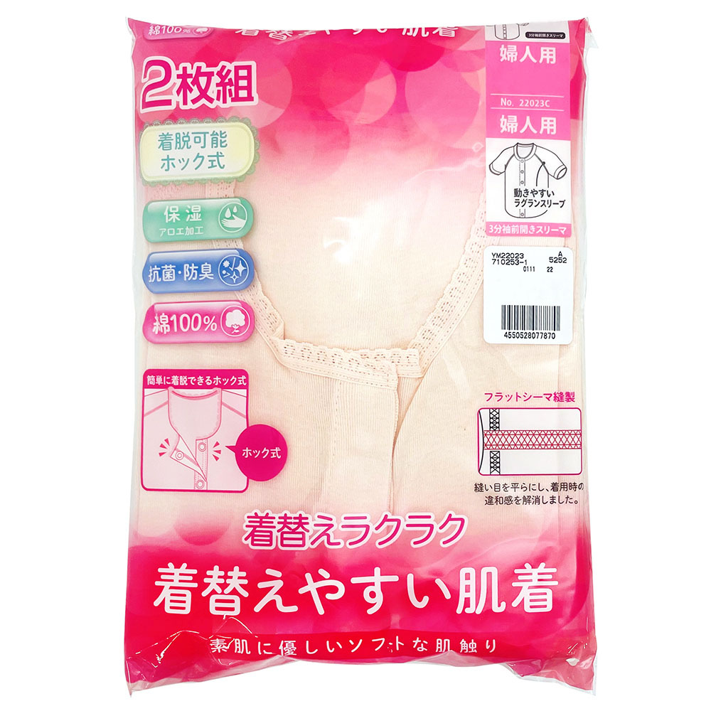 婦人 2枚組  着脱簡単ホック式前開き 3分袖スリーマ