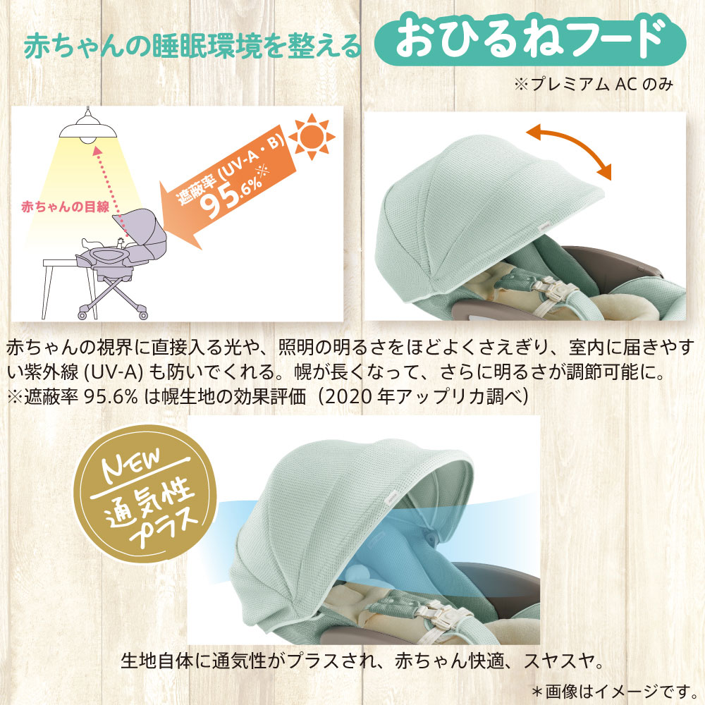 さらに、赤ちゃんの睡眠環境を整える「おひるねフード」付き。ほどよい明るさを調節でき、赤ちゃんの快適な睡眠環境を整えます。