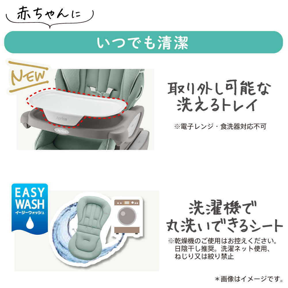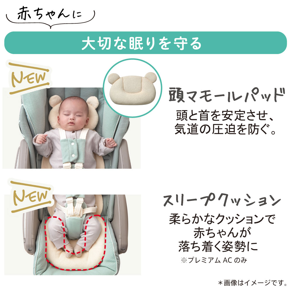 その他にも赤ちゃんの大切な眠りを守る「頭マモールパッド」と「スリープクッション」、いつでも清潔に使える「取り外し可能な洗えるトレイ」と「洗濯機で丸洗いできるシート※」も赤ちゃんにもママにも嬉しいサポートがいっぱい。