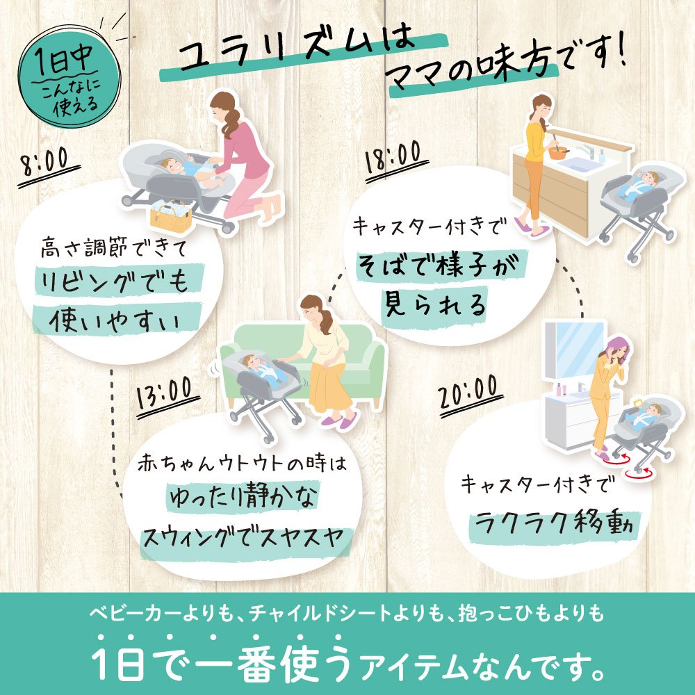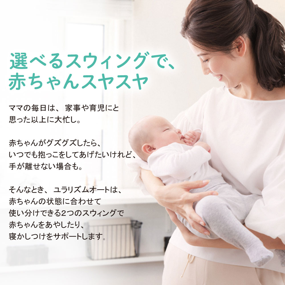 グズグズの時はしっかりスウィング、ウトウトのときはゆったりスウィング。赤ちゃんの状態に合わせて選べるスウィングで赤ちゃんをあやしたり、寝かしつけをサポートします。