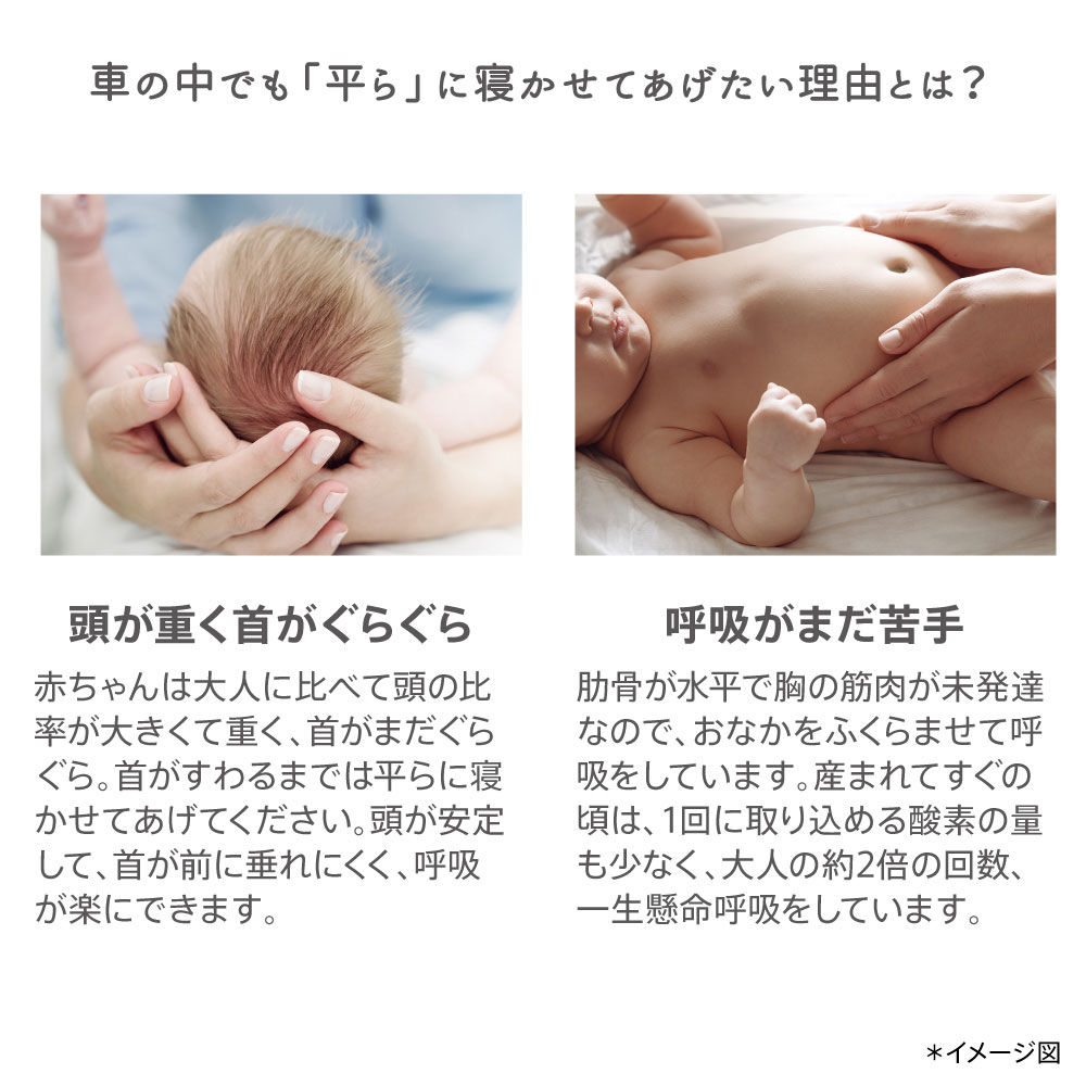 車の中でもおうちのように呼吸がしやすいフルリクライニングできるアップリカ独自の「平ら」なベッド。