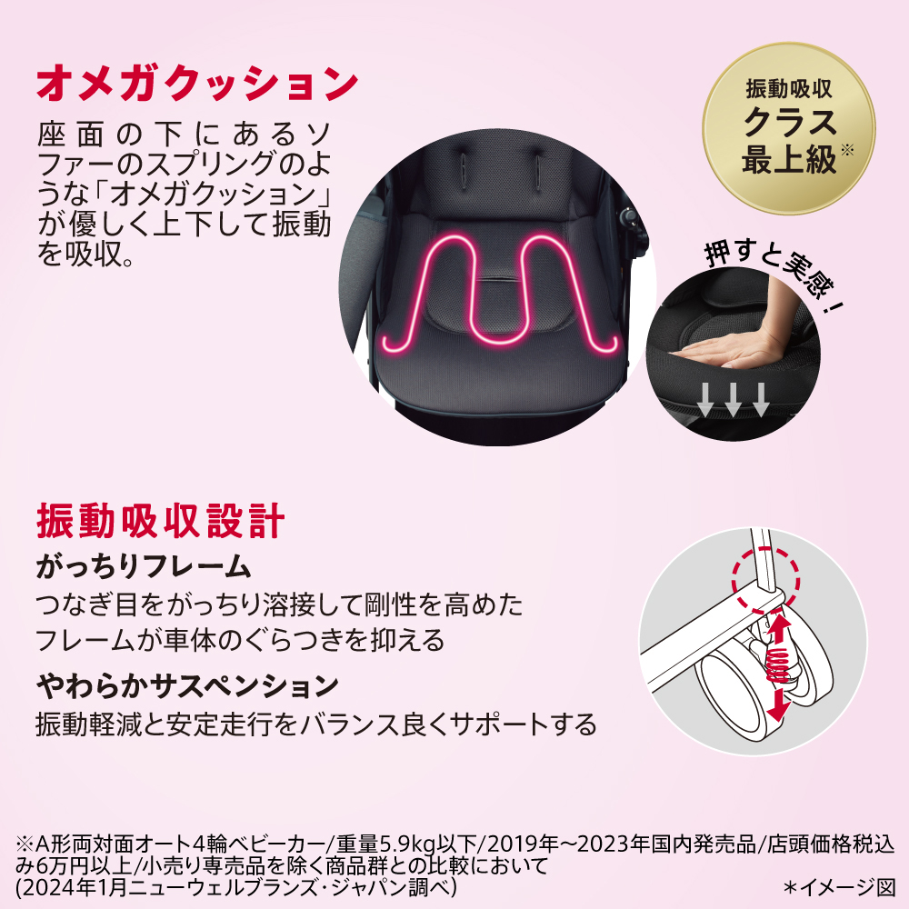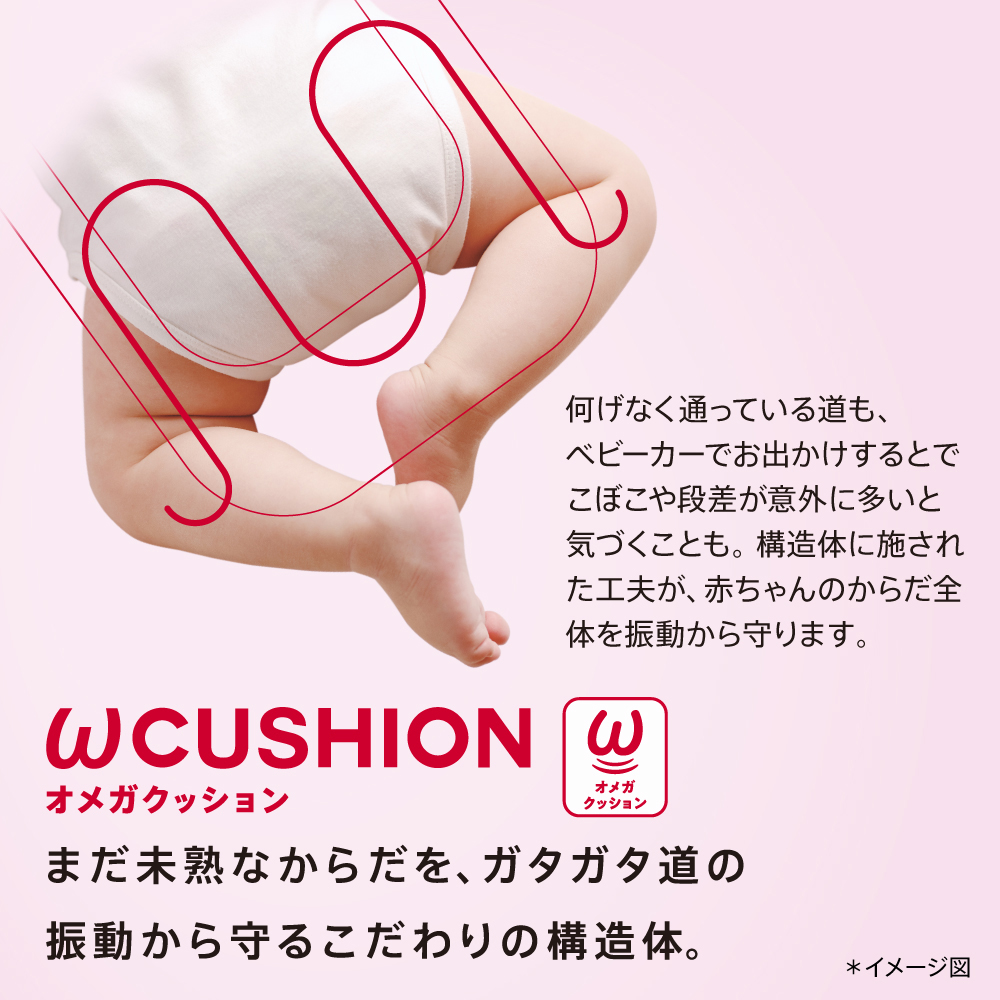 座面の下にあるソファーのスプリングのような「オメガクッション」が優しく上下して振動を吸収し、赤ちゃんの頭と首を衝撃と左右の揺れから守るこだわりのヘッドパッド「ショックレスマモール」も搭載し、赤ちゃんを振動と衝撃から守ります。