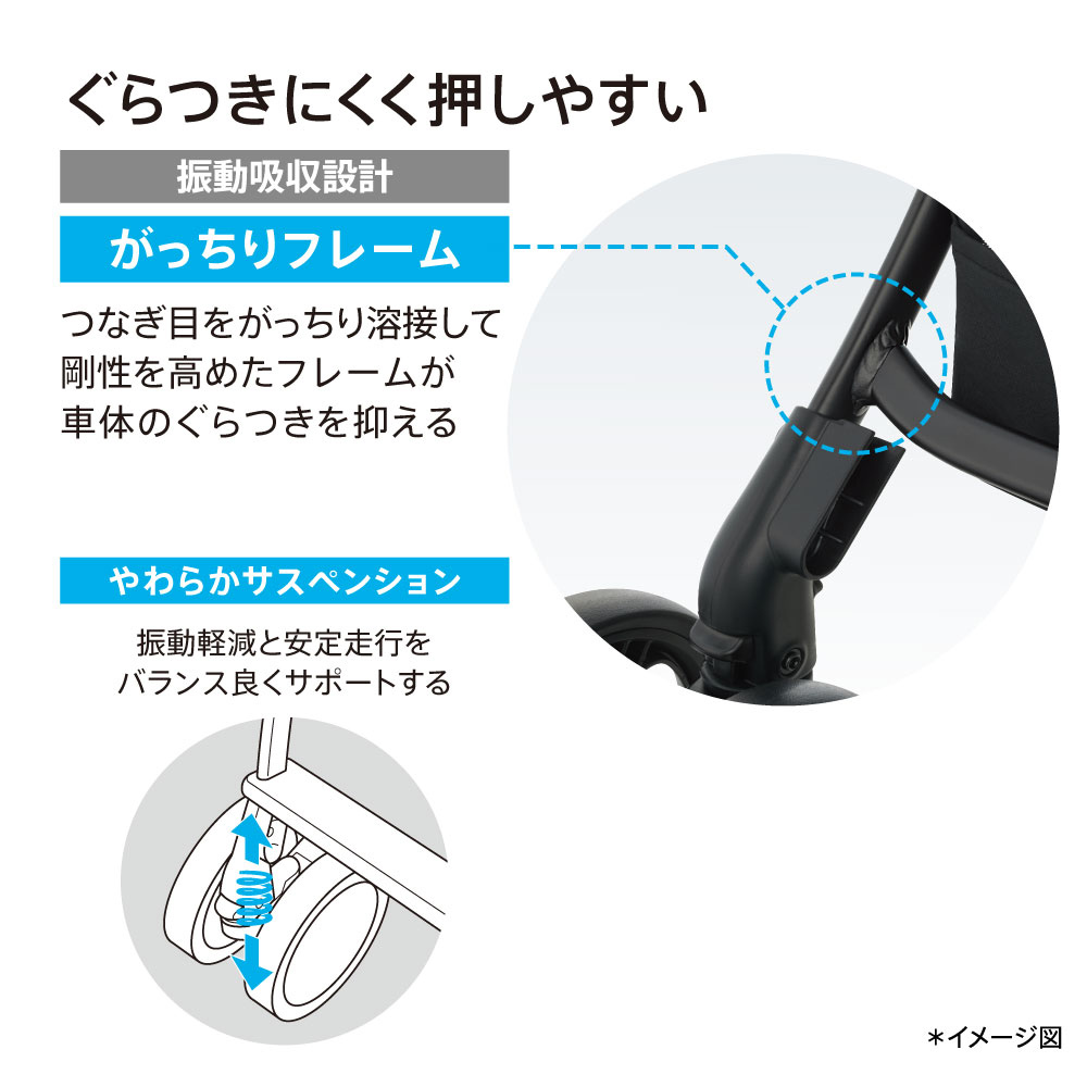 フレームのつなぎ目を溶接して剛性を高めた「がっちりフレーム」と、車輪に搭載した「やわらかサスペンション」が振動軽減します。