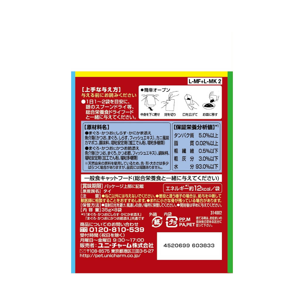 具と一緒に味わう贅沢な美味しさ。お魚の旨みがたっぷりなとろけるジュレが、お魚の身とからんで一緒に食べやすく、贅沢なおいしさを実現。8袋入り・2種のアソートタイプ。ねこ以外には与えないでください。普段と違う様子の場合は、給与を中断して獣医師に相談することをおすすめします。まれに小さな骨が残っている場合があります。直射日光を避け、風通しの良い場所に保管してください。開封後は早めに与えてください。