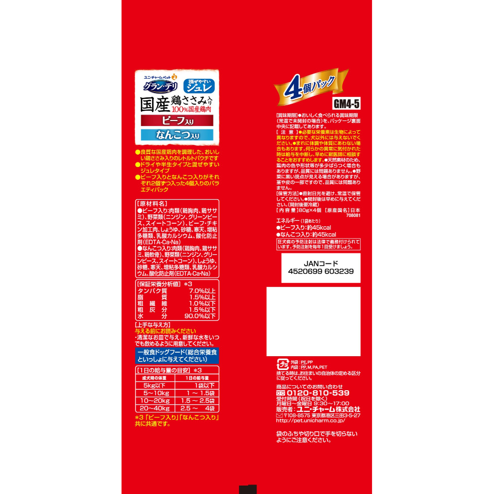 グラン・デリ 国産鶏ささみパウチジュレ成犬用4個パックビーフ・なんこつ80g×4個