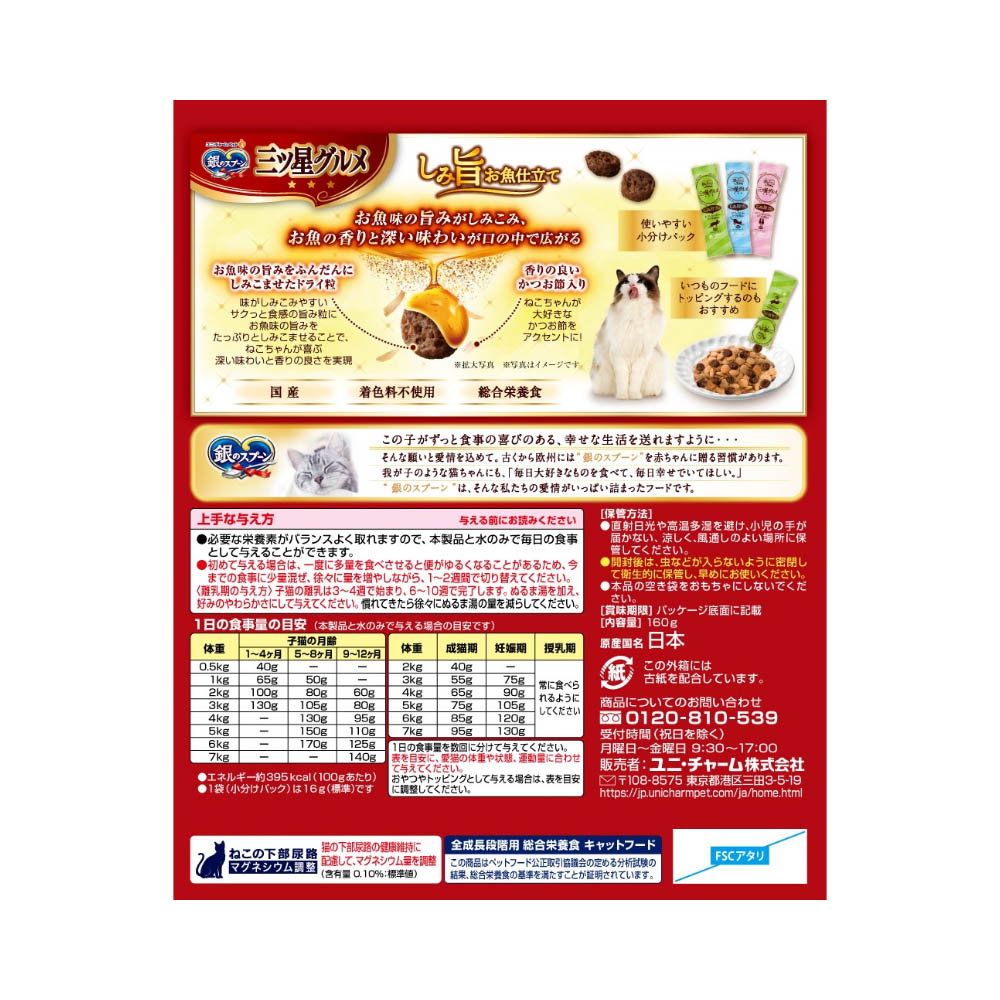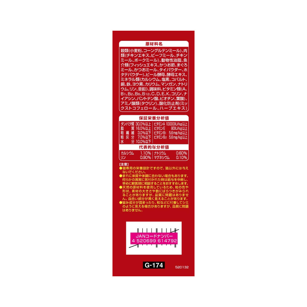 お魚味の旨みがしみこんで、深い味わいと香りの良さを実現。ネコちゃんが喜ぶかつお節入り・3種のアソートタイプ・着色料不使用・全成長段階用総合栄養食。ねこの下部尿路の健康維持に配慮して、マグネシウム量を調整。(含有量0.10%:標準値)おいしさと豊かな風味を逃さない、食べきり小分けパック16g(標準)×10袋。猫専用の栄養設計ですので、猫以外には与えないでください。まれに体質や体調に合わない場合もあります。何らかの異常に気付かれた時は給与を中断し、早めに獣医師に相談することをおすすめします。天然の原材料を使用しているため、粒の色や形状、素材の大きさや数にばらつきがみられることがありますが、品質に問題はありません。血合い部分が黒く見えることがあります。旨み成分が固まったり、粒などに付着してシミのように見える場合がありますが、品質に問題はありません。直射日光や高温多湿を避け、小児の手が届かない、涼しく、風通しのよい場所に保管してください。開封後は、虫などが入らないように密閉して衛生的に保管し、早めにお使いください。本品の空き袋をおもちゃにしないでください。
