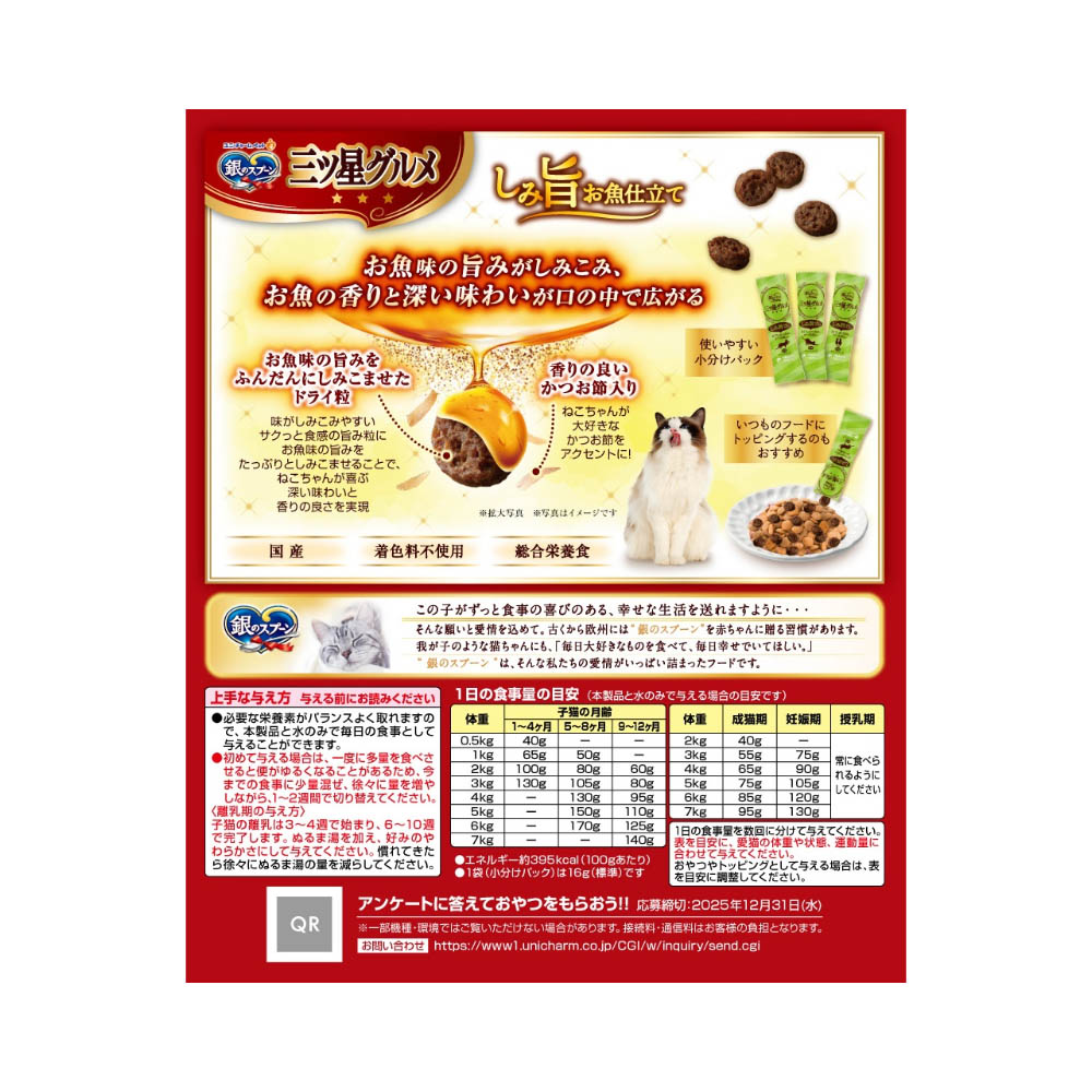 お魚味の旨みがしみこんで、深い味わいと香りの良さを実現。ねこちゃんが喜ぶかつお節入り・着色料不使用・全成長段階用総合栄養食。猫の下部尿路の健康維持に配慮して、マグネシウム量を調整。(含有量0.10%:標準値)おいしさと豊かな風味を逃さない、食べきり小分けパック16g(標準)×12袋。猫専用の栄養設計ですので、猫以外には与えないでください。まれに体質や体調に合わない場合もあります。何らかの異常に気付かれた時は給与を中断し、早めに獣医師に相談することをおすすめします。天然の原材料を使用しているため、粒の色や形状、素材の大きさや数にばらつきがみられることがありますが、品質に問題はありません。血合い部分が黒く見えることがあります。旨み成分が固まったり、粒などに付着してシミのように見える場合がありますが、品質に問題はありません。直射日光や高温多湿を避け、小児の手が届かない、涼しく、風通しのよい場所に保管してください。開封後は、虫などが入らないように密閉して衛生的に保管し、早めにお使いください。本品の空き袋をおもちゃにしないでください。