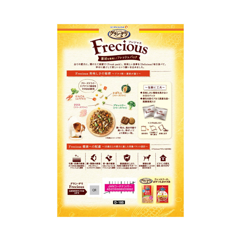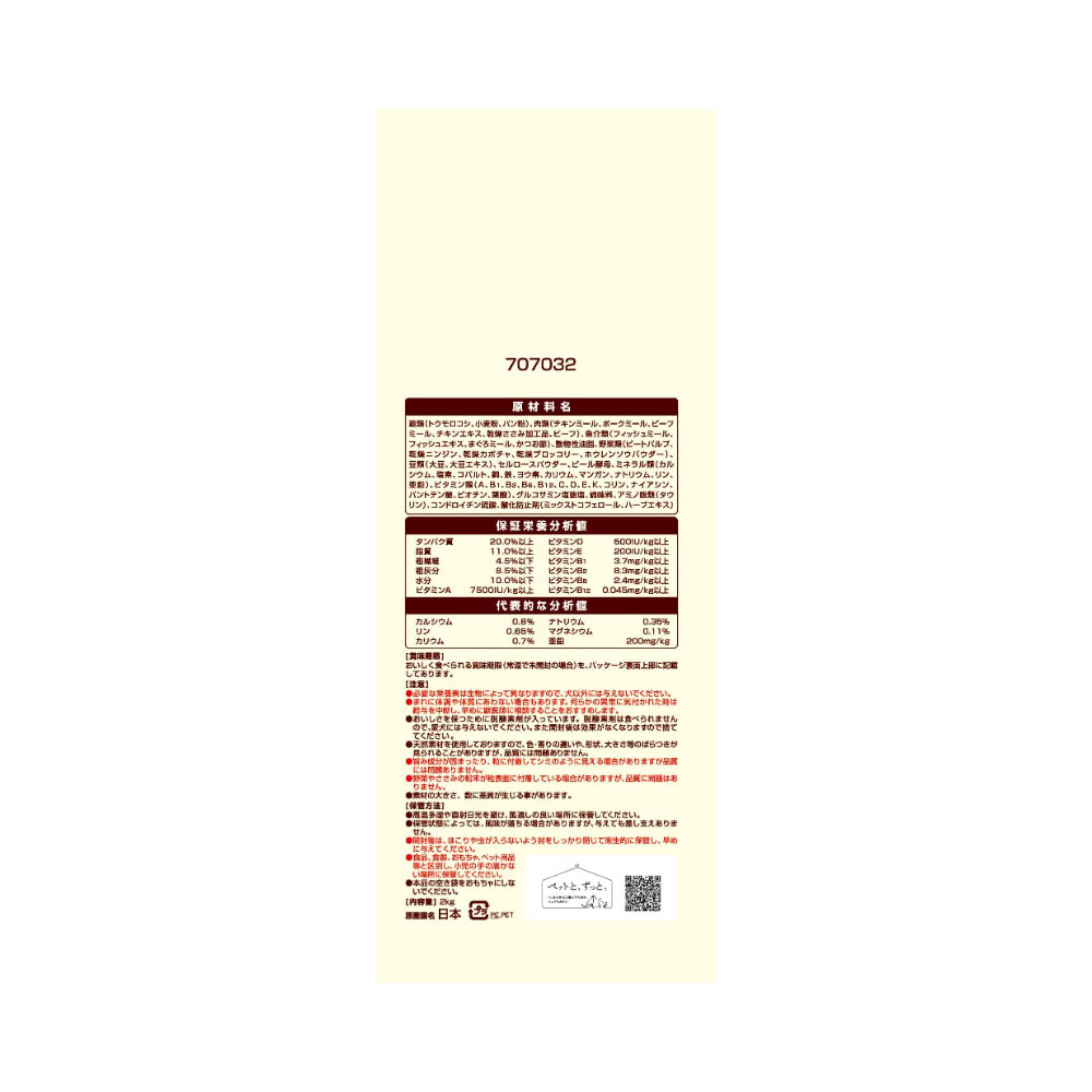 素材を美味しくフレッシュパックした国産プレミアムドッグフードです。遠赤外線で焼き上げた粒とフリーズドライ・エアドライの素材を、酸化を防ぐ鮮度維持包装をすることで、いつでも美味しくワンちゃんが喜びます。10歳以上向けの栄養バランスで、愛犬が大好きなチキン&ビーフ入りです。必要な栄養素は生物によって異なりますので、犬以外には与えないでください。まれに体調や体質にあわない場合もあります。何らかの異常に気付かれた時は給与を中断し、早めに獣医師に相談することをおすすめします。おいしさを保つために脱酸素剤が入っています。脱酸素剤は食べられませんので、愛犬には与えないでください。また開封後は効果がなくなりますので捨ててください。天然素材を使用しておりますので、色・香りの違いや、形状、大きさ等のばらつきが見られることがありますが、品質には問題ありません。旨み成分が固まったり、粒に付着してシミのように見える場合がありますが品質には問題ありません。野菜やささみの粉末が粒表面に付着している場合がありますが、品質に問題はありません。素材の大きさ、数に差異が生じる事があります。高温多湿や直射日光を避け、風通しの良い場所に保管してください。保管状態によっては、風味が落ちる場合がありますが、与えても差し支えありません。開封後は、ほこりや虫が入らないよう封をしっかり閉じて衛生的に保管し、早めに与えてください。食品、食器、おもちゃ、ペット用品等と区別し、小児の手の届かない場所に保管してください。本品の空き袋をおもちゃにしないでください。