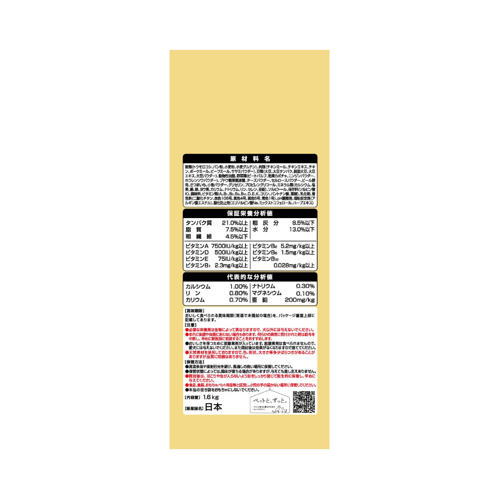 愛犬が大好きな素材を豊富に使用しました。グルメなわんちゃんにぴったりな美味しいドライフード。食感を楽しむ、チーズを加えたささみ入り粒たっぷり。素材そのままの乾燥かぼちゃ入り・さつまいもを使用したお芋粒入り・ささみ入りの大豆フレーク入り・成犬用総合栄養食。必要な栄養素は生物によって異なりますので、犬以外には与えないでください。まれに体調や体質にあわない場合もあります。何らかの異常に気付かれた時は給与を中断し、早めに獣医師に相談することをおすすめします。おいしさを保つために脱酸素剤が入っています。脱酸素剤は食べられませんので、愛犬には与えないでください。また開封後は効果がなくなりますので捨ててください。天然素材を使用しておりますので、色、形状、大きさ等多少ばらつきがあることがありますが品質に問題はありません。高温多湿や直射日光を避け、風通しの良い場所に保管してください。保管状態によっては、風味が落ちる場合がありますが、与えても差し支えありません。開封後は、ほこりや虫が入らないよう封をしっかり閉じて衛生的に保管し、早めに与えてください。食品、食器、おもちゃ、ペット用品等と区別し、小児の手の届かない場所に保管してください。本品の空き袋をおもちゃにしないでください。