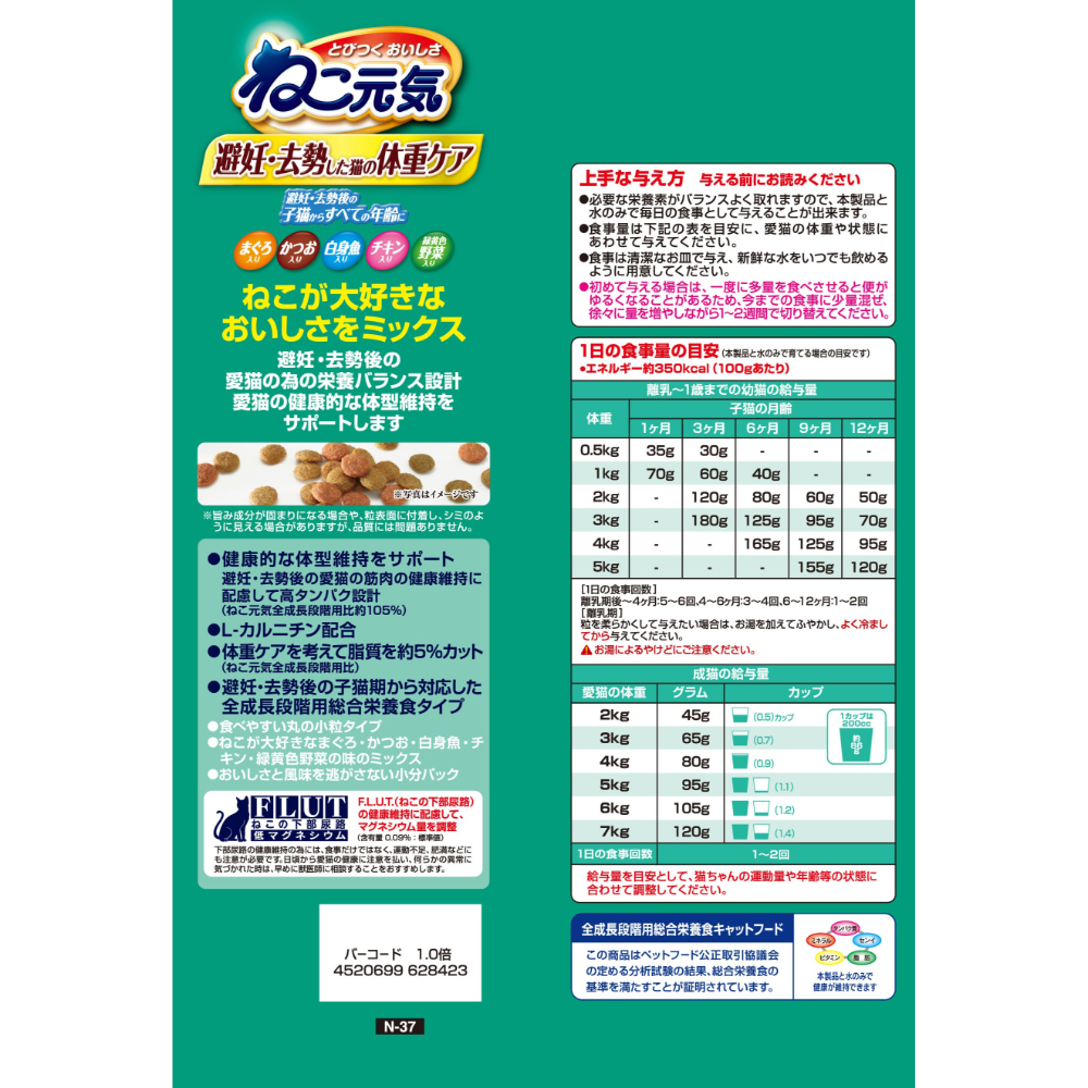 避妊、去勢後の愛猫の筋肉の健康維持に配慮して、高タンパク設計(ねこ元気全成長段階用比約105%)。L-カルニチン配合。体重ケアを考えて、脂質を約5%カット(ねこ元気全成長段階用比)。避妊、去勢後の子猫期から対応した全成長段階用総合栄養食。