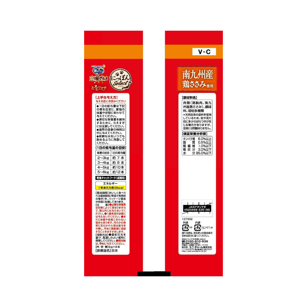 日本各地の「お取り寄せ」素材を使用した、とろ~りウェットタイプの上質なおやつ。6gで食べきりサイズ・国産、無着色。必要な栄養素は生物によって異なりますので、猫以外には与えないでください。1歳未満の幼猫には与えないでください。まれに体調や体質に合わない場合もあります。何らかの異常に気付かれた時は給与を中断し、早めに獣医師に相談することをおすすめします。直射日光を避け、風通しのよい場所に保管してください。開封後は、早めに与えてください。