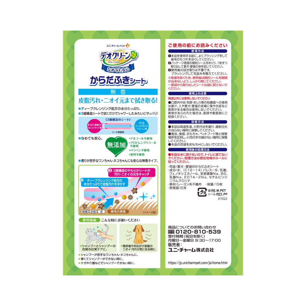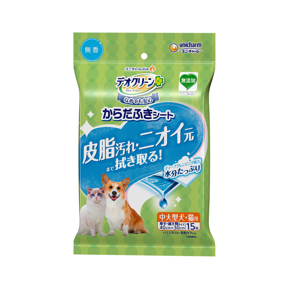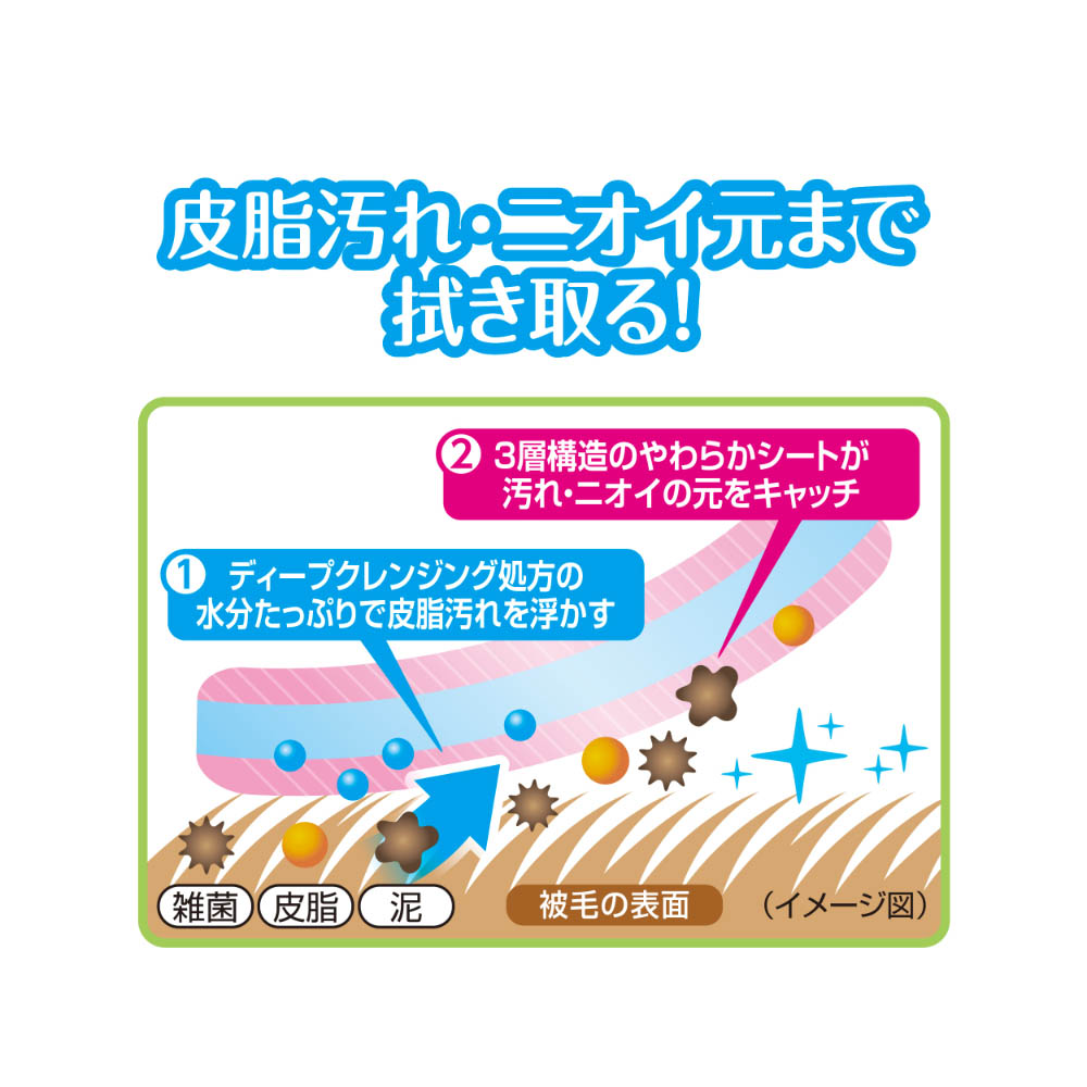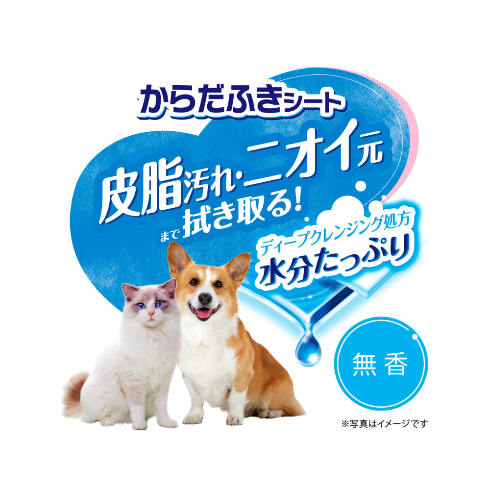 皮脂汚れやニオイ元まで拭き取る犬猫用からだふきシート。ペットがなめても安心・無添加。(アルコール、プロピレングリコール、パラベン、香料不使用)3層構造の厚手シートで水分たっぷりだから1枚で全身ふける。厚手超大判サイズ。用途以外には使用しないでください口腔内や目・耳腔・おしり等の粘膜面への使用は避け、人や愛犬・愛猫の皮膚に傷や炎症など異常がある場合は使用しないでください。異常があらわれた場合は、医師や獣医師にご相談ください。本品は高温多湿、火気付近を避け、直射日光の当らない場所に保管してください。食品、食器、おもちゃ、ペットフード等と保管場所を区別し、小児の手の届かない場所に保管してください。本品の空袋をおもちゃにしないでください。