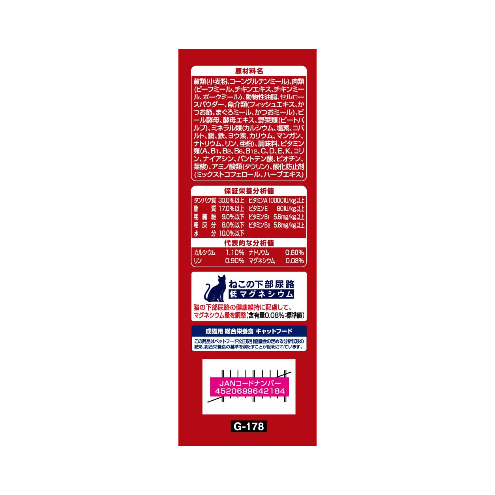 お魚味の旨みがしみこんで、深い味わいと香りの良さを実現。毛づくろい等で飲み込んでしまった毛の排泄を助けるために、食物繊維を配合。ねこちゃんが喜ぶかつお節入り。着色料不使用。成猫用総合栄養食。猫の下部尿路の健康維持に配慮して、マグネシウム量を調整。(含有量0.08%:標準値)おいしさと豊かな風味を逃さない、食べきり小分けパック16g(標準)×12袋。猫専用の栄養設計ですので、猫以外には与えないでください。まれに体質や体調に合わない場合もあります。何らかの異常に気付かれた時は給与を中断し、早めに獣医師に相談することをおすすめします。天然の原材料を使用しているため、粒の色や形状、素材の大きさや数にばらつきがみられることがありますが、品質に問題はありません。血合い部分が黒く見えることがあります。旨み成分が固まったり、粒などに付着してシミのように見える場合がありますが、品質に問題はありません。直射日光や高温多湿を避け、小児の手が届かない、涼しく、風通しのよい場所に保管してください。開封後は、虫などが入らないように密閉して衛生的に保管し、早めにお使いください。本品の空き袋をおもちゃにしないでください。