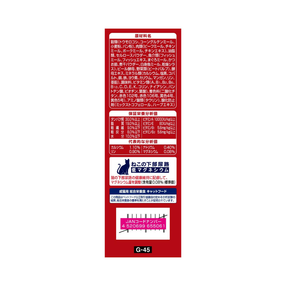 贅沢な素材の旨みたっぷりで、香ばしく焼き上げた三ツ星のおいしさ。カリッと食感の粒が入って、色々な食感が楽しめます。毛づくろい等で飲み込んでしまった毛の排泄を助けるために、食物繊維を配合。猫の下部尿路の健康維持に配慮して、マグネシウム量を調整。(含有量0.08%:標準値)おいしさと豊かな風味を逃さない、食べきり小分けパック20g(標準)×12袋。猫専用の栄養設計ですので、猫以外には与えないでください。まれに体質や体調に合わない場合もあります。何らかの異常に気付かれた時は給与を中断し、早めに獣医師に相談することをおすすめします。天然の原材料を使用しているため、色や形状などにばらつきがみられることがありますが、品質に問題はありません。旨み成分が固まったり、粒などに付着してシミのように見える場合がありますが、品質に問題はありません。直射日光や高温多湿を避け、小児の手が届かない、涼しく、風通しのよい場所に保管してください。開封後は、虫などが入らないように密閉して衛生的に保管し、早めにお使いください。本品の空き袋をおもちゃにしないでください。