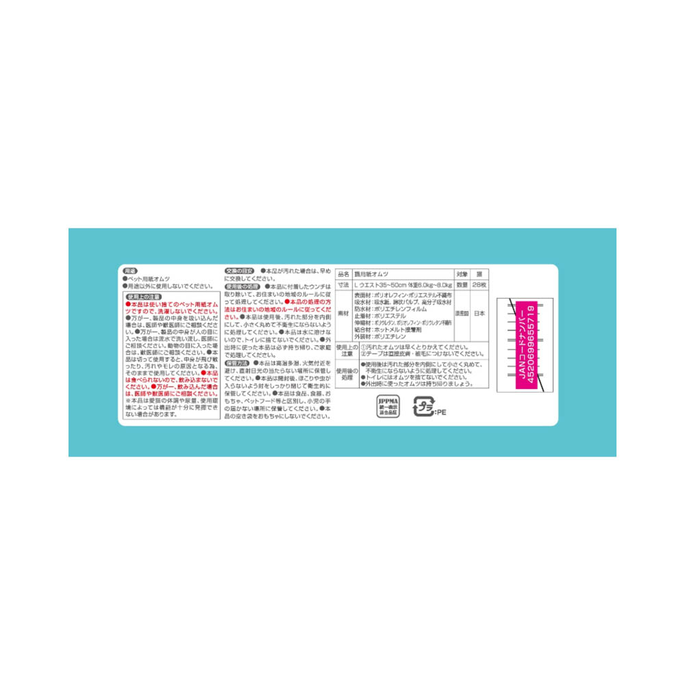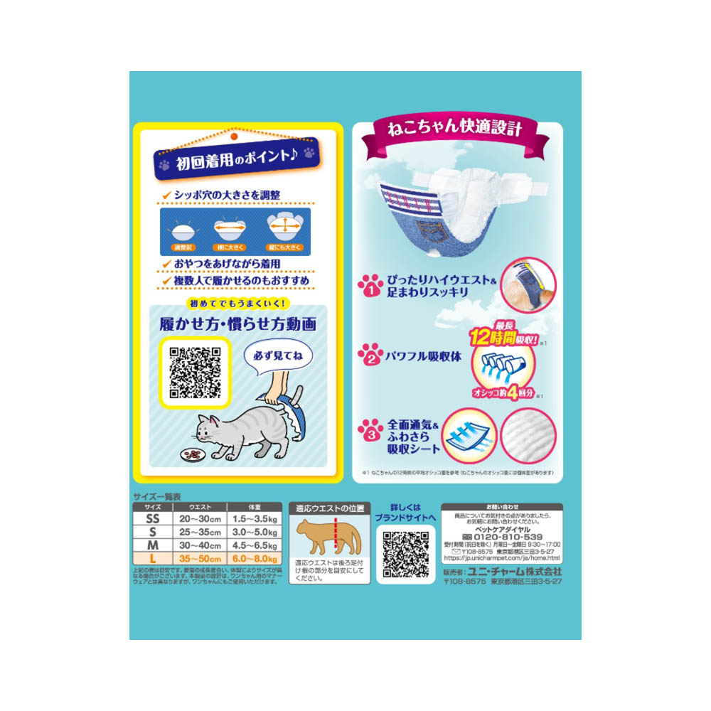 足まわりスッキリ構造:細型形状で、動きにフィットし嫌がらない。ぴったりハイウエスト:動いてもズレにくい。3段階に大きさ調整可能なシッポ穴。パワフル吸収体:最長12時間のオシッコをしっかり吸収。※ねこちゃんの12時間の平均オシッコ量を参考。ねこちゃんのオシッコ量には個体差があります。ふわさら吸収シート&全面通気シート:お肌さらさらで快適。1.汚れたオムツは早くとりかえてください。2.テープは直接皮膚・被毛につけないでください。本品は高温多湿、火気付近を避け、直射日光の当たらない場所に保管してください。本品は開封後、ほこりや虫が入らないよう封をしっかり閉じて衛生的に保管してください。本品は食品、食器、おもちゃ、ペットフード等と区別し、小児の手の届かない場所に保管してください。本品の空き袋をおもちゃにしないでください。