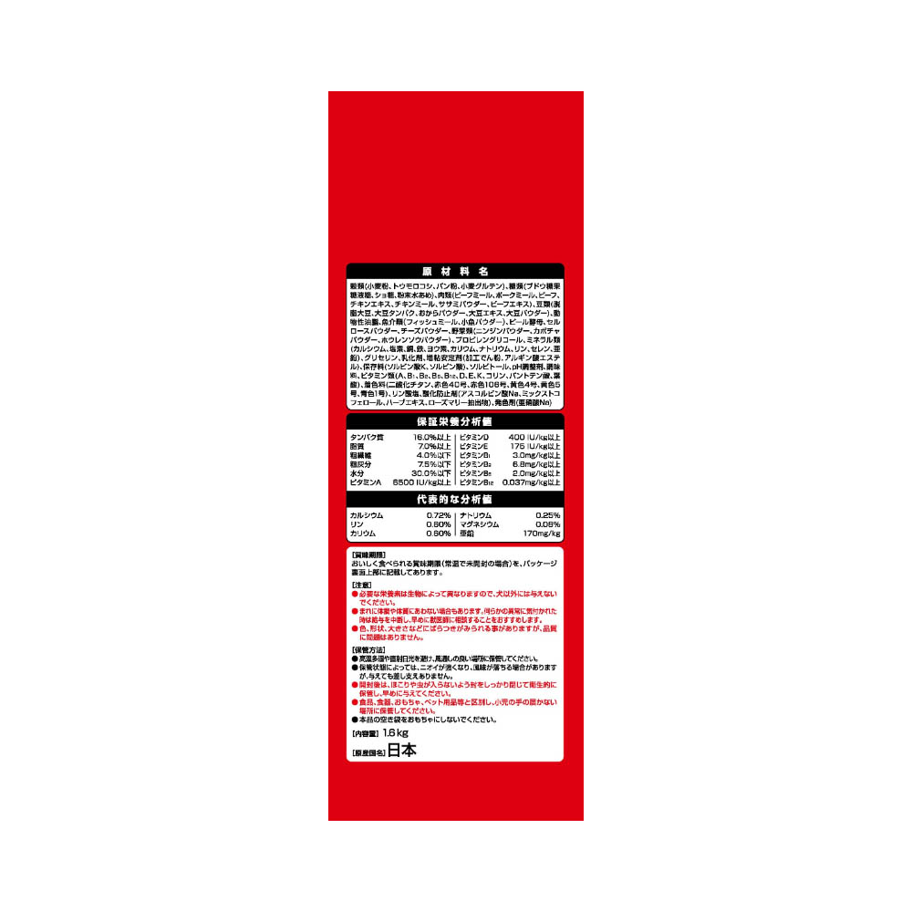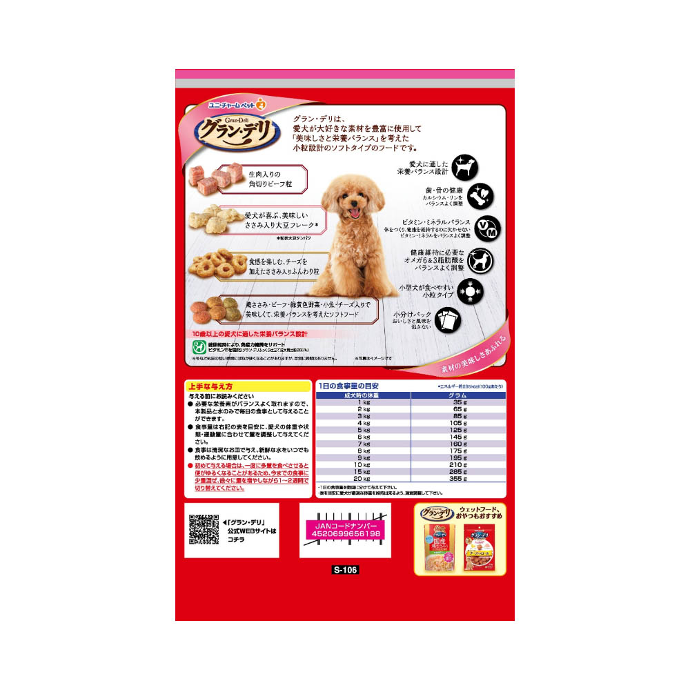国産のお肉たっぷり、美味しいふっくら仕立てのグルメフード。角切りビーフ粒・ささみ入りふんわり粒・ささみ入り大豆フレーク入り・ビタミンEを強化し、10歳以上の愛犬の健康維持により免疫力維持をサポート。(グラン・デリふっくら仕立て成犬用比約265%)栄養素をバランス良く摂取できる総合栄養食。健康維持に必要なオメガ6&3脂肪酸をバランス良く調整。必要な栄養素は生物によって異なりますので、犬以外には与えないでください。まれに体調や体質にあわない場合もあります。何らかの異常に気付かれた時は給与を中断し、早めに獣医師に相談することをおすすめします。色、形状、大きさなどにばらつきがみられる事がありますが、品質に問題はありません。高温多湿や直射日光を避け、風通しの良い場所に保管してください。保管状態によっては、ニオイが強くなり、風味が落ちる場合がありますが、与えても差し支えありません。開封後は、ほこりや虫が入らないよう封をしっかり閉じて衛生的に保管し、早めに与えてください。食品、食器、おもちゃ、ペット用品等と区別し、小児の手の届かない場所に保管してください。本品の空き袋をおもちゃにしないでください。