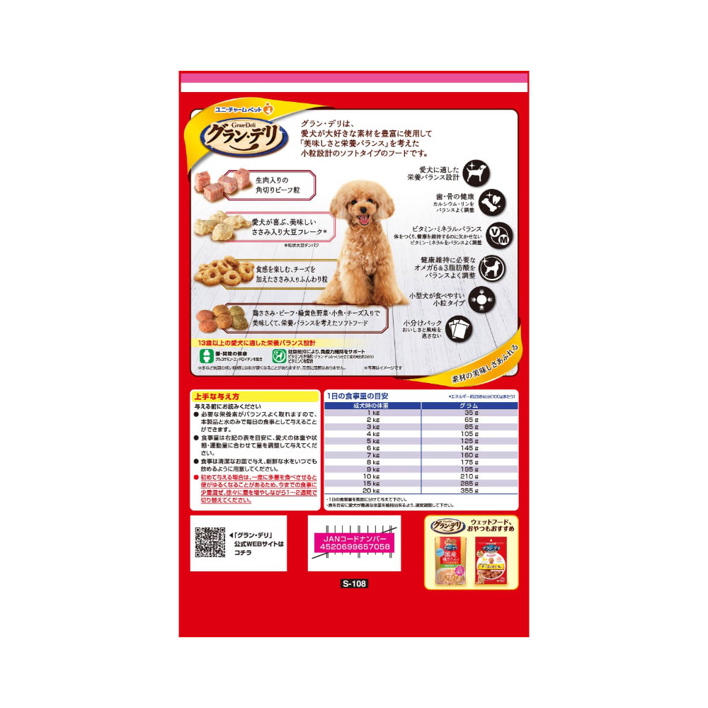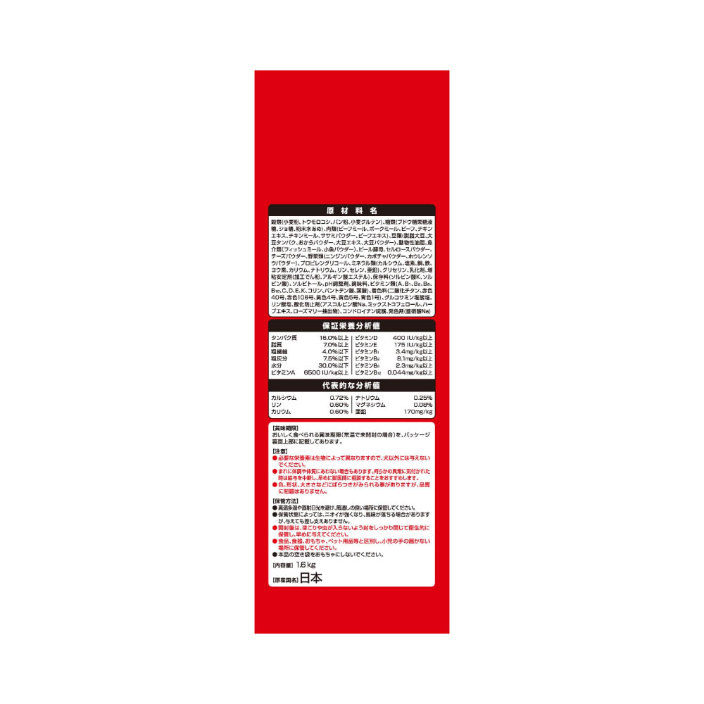 国産のお肉たっぷり、美味しいふっくら仕立てのグルメフード。角切りビーフ粒・ささみ入りふんわり粒・ささみ入り大豆フレーク入り。13歳以上の愛犬の腰・関節の健康維持のために、グルコサミン・コンドロイチンを配合。栄養素をバランス良く摂取できる総合栄養食。健康維持に必要なオメガ6&3脂肪酸をバランス良く調整。必要な栄養素は生物によって異なりますので、犬以外には与えないでください。まれに体調や体質にあわない場合もあります。何らかの異常に気付かれた時は給与を中断し、早めに獣医師に相談することをおすすめします。色、形状、大きさなどにばらつきがみられる事がありますが、品質に問題はありません。高温多湿や直射日光を避け、風通しの良い場所に保管してください。保管状態によっては、ニオイが強くなり、風味が落ちる場合がありますが、与えても差し支えありません。開封後は、ほこりや虫が入らないよう封をしっかり閉じて衛生的に保管し、早めに与えてください。食品、食器、おもちゃ、ペット用品等と区別し、小児の手の届かない場所に保管してください。本品の空き袋をおもちゃにしないでください。