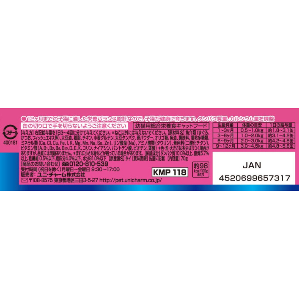 12ヶ月までの子猫に適した栄養バランス設計なので、子猫が健康に育ちます。タンパク質量、カルシウム量を調整。食べやすい細かめフレーク。発色剤不使用。まぐろとかつお。