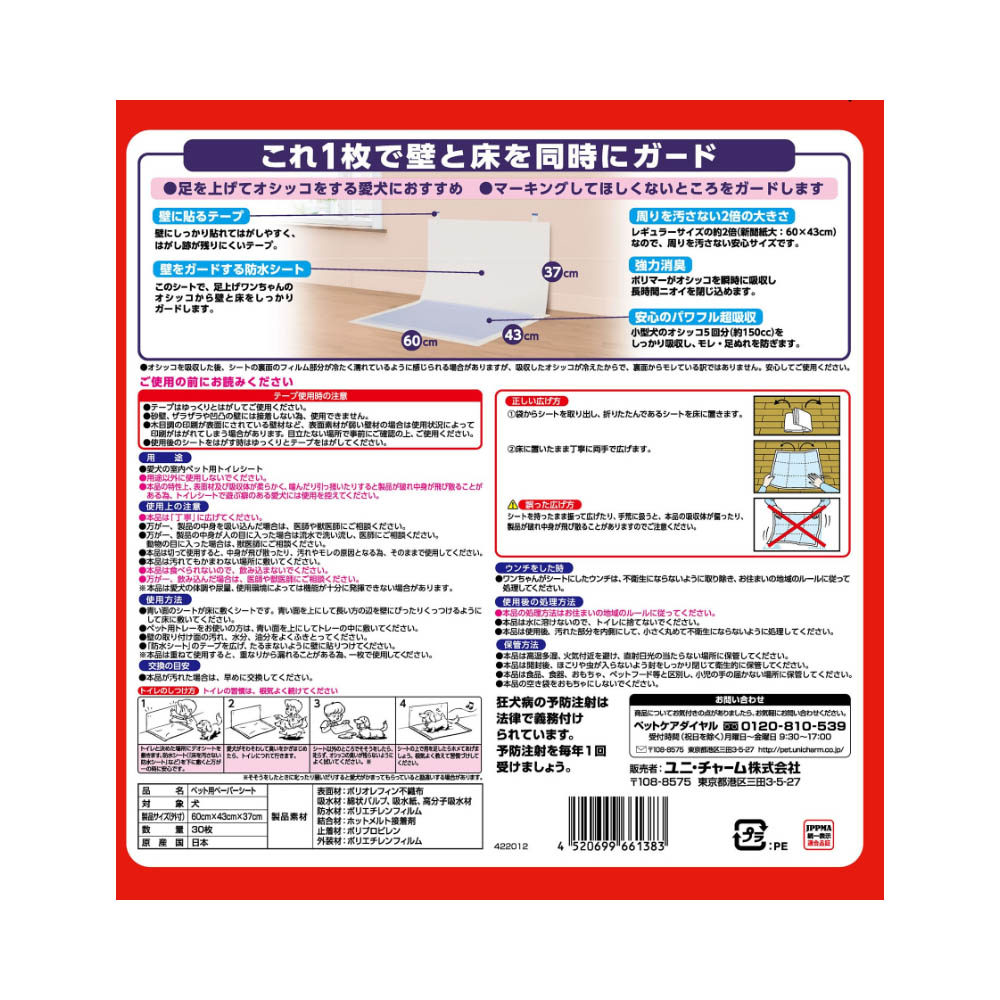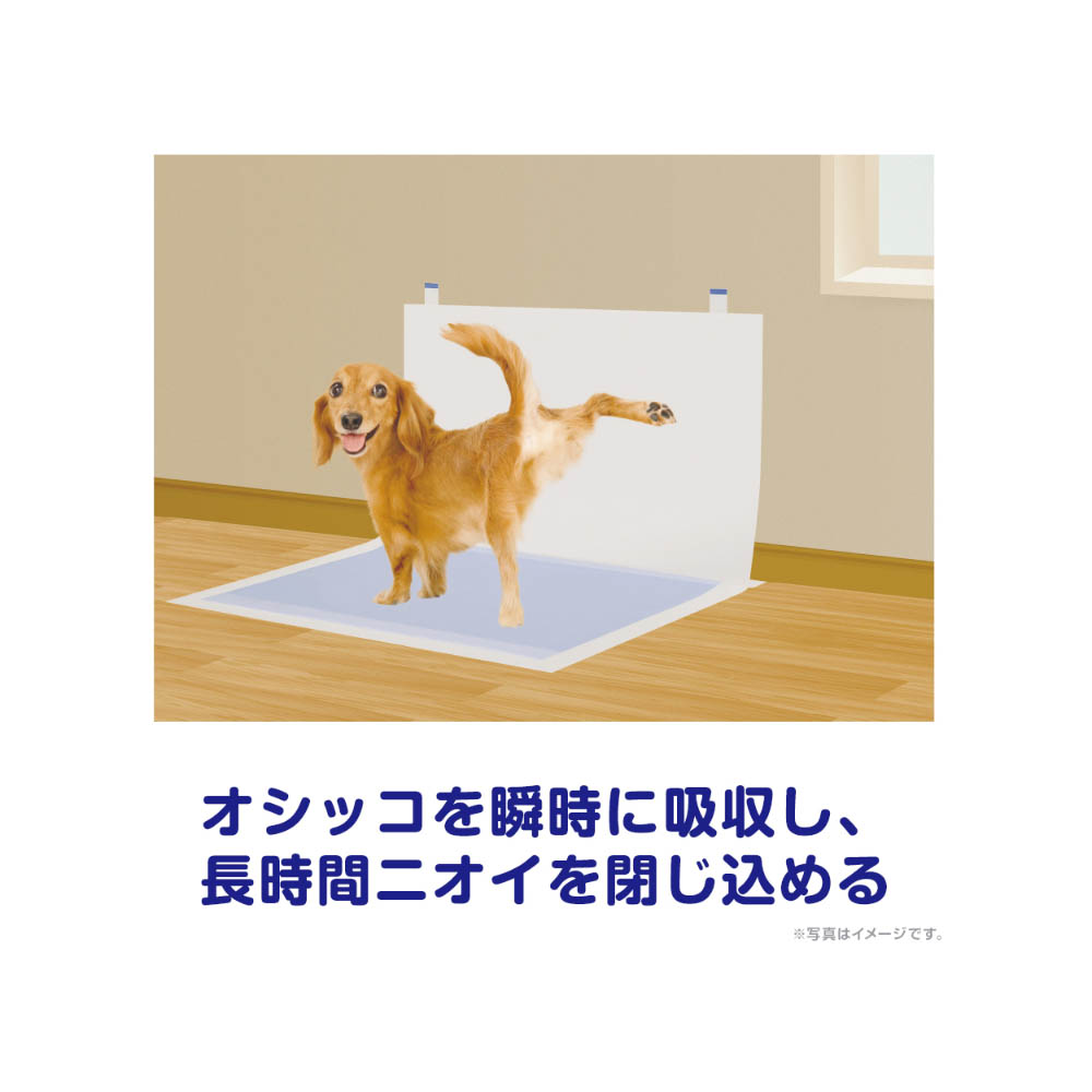 壁をガードする「防水シート」は防水加工フィルムを採用しているので、壁の汚れを防ぎます。床側のシートはスピード吸収でオシッコをしっかり閉じ込めます。床側のシートサイズ。ワイド:60×43cm本品は「丁寧」に広げてください。万が一、製品の中身を吸い込んだ場合は、医師や獣医師にご相談ください。万が一、製品の中身が人の目に入った場合は流水で洗い流し、医師にご相談ください。動物の目に入った場合は、獣医師にご相談ください。本品は切って使用すると、中身が飛び散ったり、汚れやモレの原因となる為、そのままで使用してください。本品は汚れてもかまわない場所に敷いてください。本品は食べられないので、飲み込まないでください。万が一、飲み込んだ場合は、医師や獣医師にご相談ください。※本品は愛犬の体調や尿量、使用環境によっては機能が十分に発揮できない場合があります。本品は高温多湿、火気付近を避け、直射日光の当たらない場所に保管してください。本品は開封後、ほこりや虫が入らないよう封をしっかり閉じて衛生的に保管してください。本品は食品、食器、おもちゃ、ペットフード等と区別し、小児の手の届かない場所に保管してください。本品の空き袋をおもちゃにしないでください。