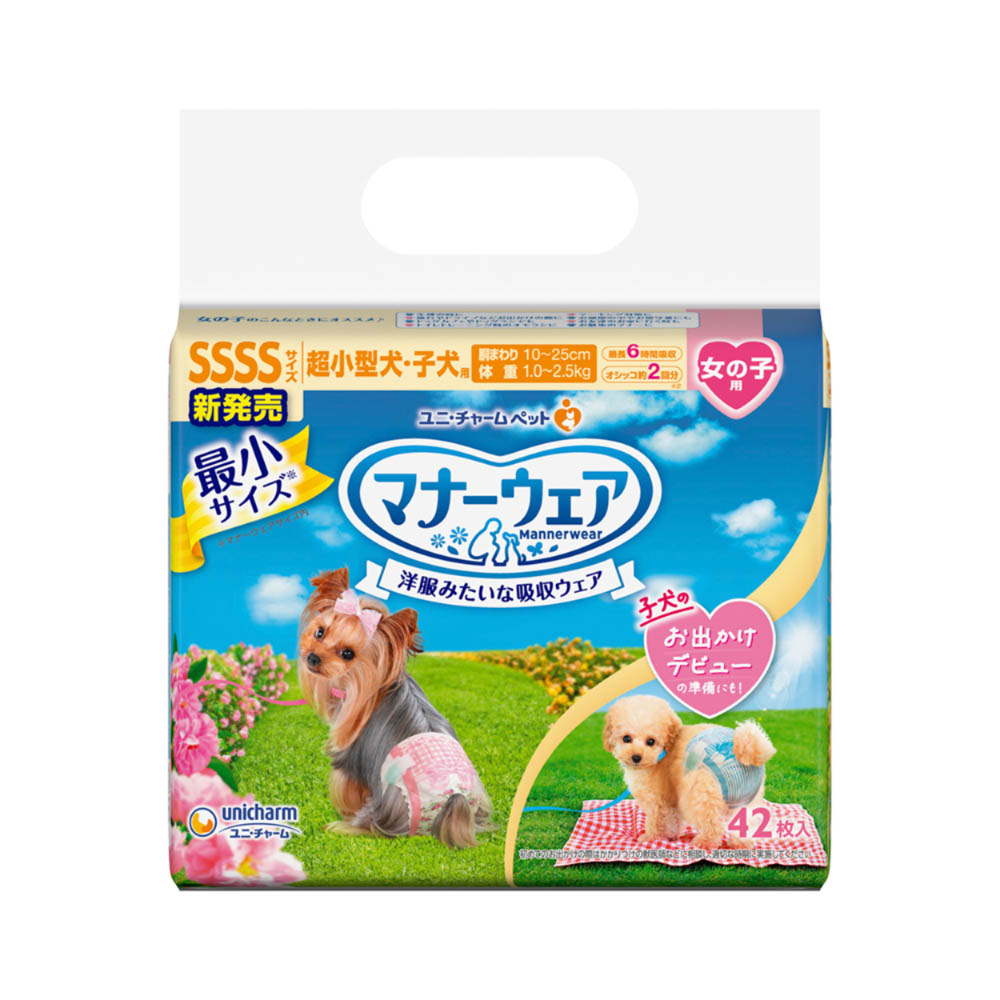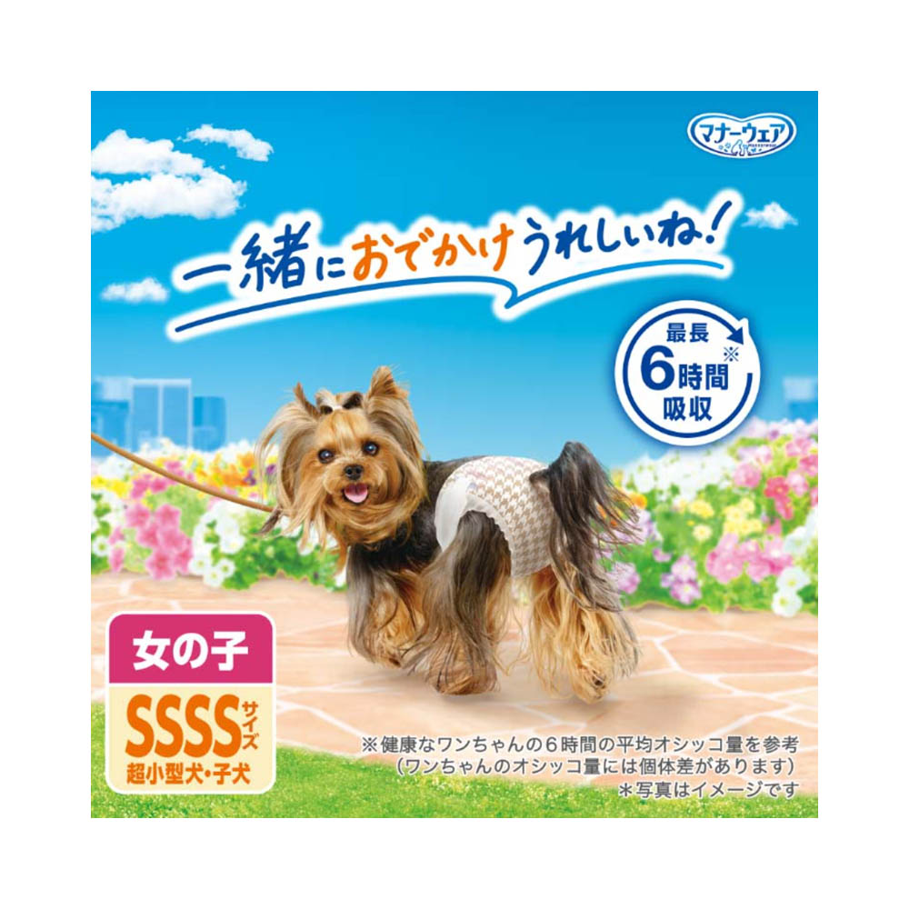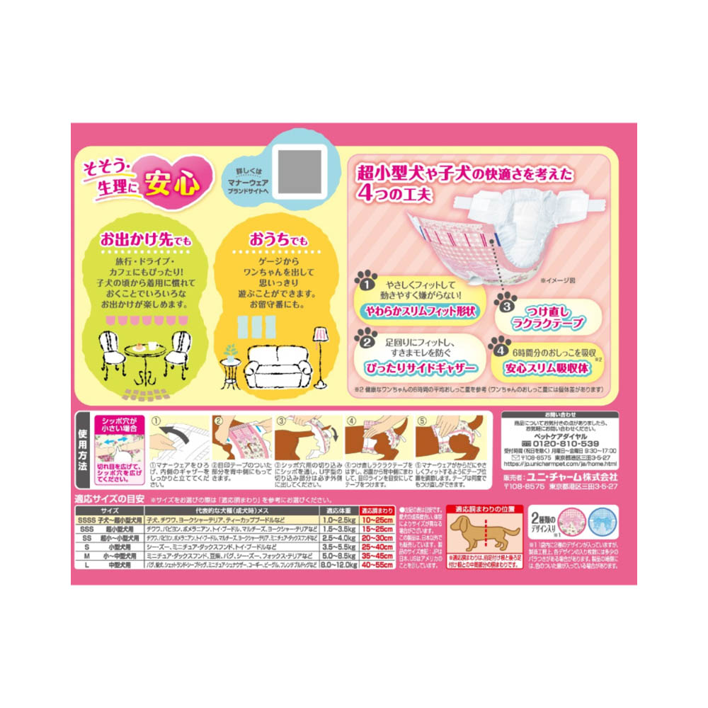 そそう・生理に安心。お出かけ先でもおうちでも!「やわらかスリムフィット形状」で、やさしくフィットして動きやすく嫌がらない。「ぴったりサイドギャザー」で、足回りにフィットし、すきまモレを防ぐ。「安心スリム吸収体」で、6時間分のおしっこを吸収※健康なワンちゃんの6時間の平均おしっこ量を参考(ワンちゃんのおしっこ量には個体差があります)本品は使い捨てのペット用紙オムツですので、洗濯しないでください。万が一、製品の中身を吸い込んだ場合は、医師や獣医師にご相談ください。万が一、製品の中身が人の目に入った場合は流水で洗い流し、医師にご相談ください。動物の目に入った場合は、獣医師にご相談ください。本品は切って使用すると、中身が飛び散ったり、汚れやモレの原因となる為、そのままで使用してください。テープは直接皮膚・被毛につけないでください。本品は食べられないので、飲み込まないでください。万が一、飲み込んだ場合は、医師や獣医師にご相談ください。※本品は愛犬の体調や尿量、使用環境によっては機能が十分に発揮できない場合があります。本品は高温多湿、火気付近を避け、直射日光の当たらない場所に保管してください。本品は開封後、ほこりや虫が入らないよう封をしっかり閉じて衛生的に保管してください。本品は食品、食器、おもちゃ、ペットフード等と区別し、小児の手の届かない場所に保管してください。本品の空き袋をおもちゃにしないでください。