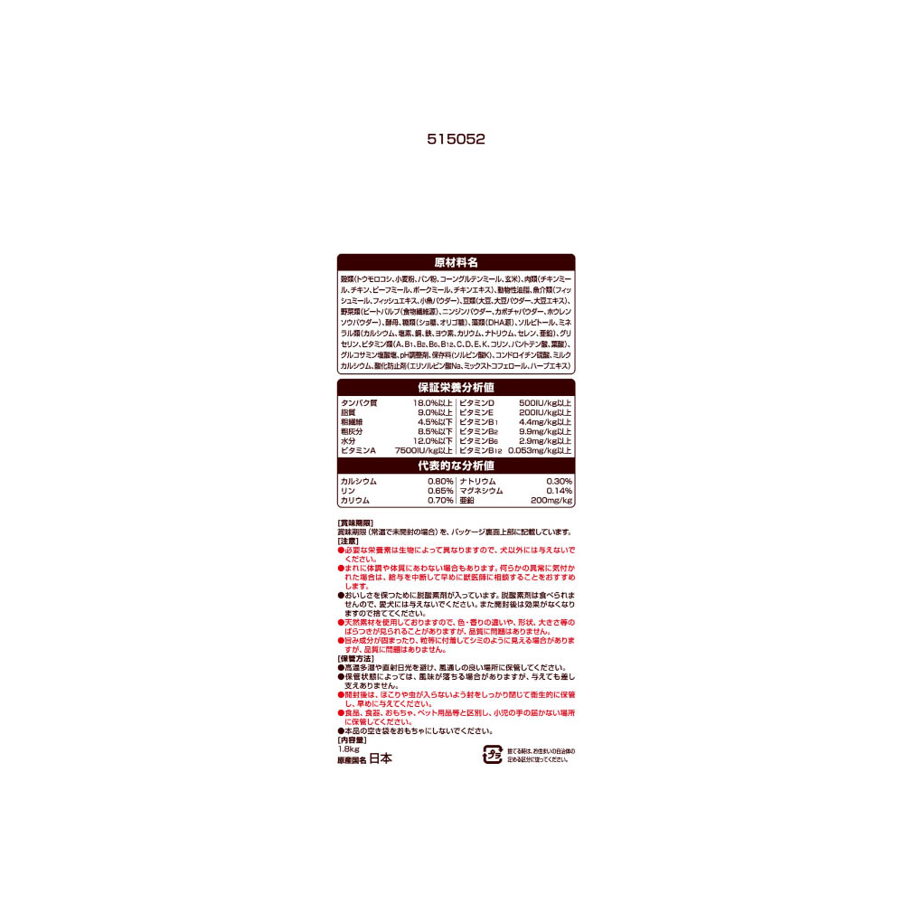 13歳以上のミニチュア・ダックスフンドに合わせた専用設計。腰・関節の健康のためにグルコサミン・コンドロイチンを強化。ビタミンE強化、ビタミンC配合で健康により免疫力維持をサポート。骨・歯の健康のためにカルシウム・リンをバランスよく調整。毛艶・皮膚の健康のためにオメガ6&3脂肪酸をバランスよく調整。健康な便に配慮して食物繊維たっぷりの素材を配合。※BBカリカリ仕立Mダックス用成犬用比必要な栄養素は生物によって異なりますので、犬以外には与えないでください。まれに体調や体質にあわない場合もあります。何らかの異常に気付かれた場合は、給与を中断して早めに獣医師に相談することをおすすめします。おいしさを保つために脱酸素剤が入っています。脱酸素剤は食べられませんので、愛犬には与えないでください。また開封後は効果がなくなりますので捨ててください。天然素材を使用しておりますので、色・香りの違いや、形状、大きさ等のばらつきが見られることがありますが、品質に問題はありません。旨み成分が固まったり、粒等に付着してシミのように見える場合がありますが、品質に問題はありません。高温多湿や直射日光を避け、風通しの良い場所に保管してください。保管状態によっては、風味が落ちる場合がありますが、与えても差し支えありません。開封後は、ほこりや虫が入らないよう封をしっかり閉じて衛生的に保管し、早めに与えてください。食品、食器、おもちゃ、ペット用品等と区別し、小児の手の届かない場所に保管してください。本品の空き袋をおもちゃにしないでください。