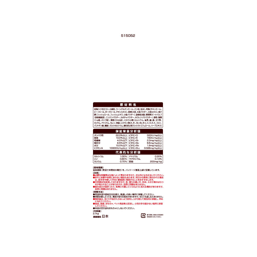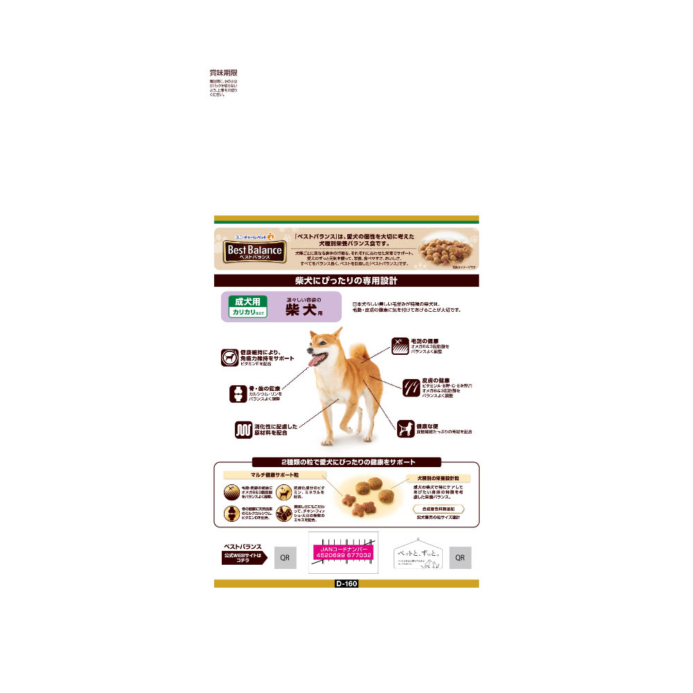 柴犬に合わせた専用設計。毛艶の健康のためにオメガ6&3脂肪酸をバランスよく調整。皮膚の健康のためにビタミンA・B群・C・Eを配合。オメガ6&3脂肪酸をバランスよく調整。骨・歯の健康のためにカルシウム・リンをバランスよく調整。消化性に配慮した原材料を配合。ビタミンE配合で健康維持により免疫力維持をサポート。健康な便に配慮して食物繊維たっぷりの素材を配合。必要な栄養素は生物によって異なりますので、犬以外には与えないでください。まれに体調や体質にあわない場合もあります。何らかの異常に気付かれた場合は、給与を中断して早めに獣医師に相談することをおすすめします。天然素材を使用しておりますので、色・香りの違いや、形状、大きさ等のばらつきが見られることがありますが、品質に問題はありません。旨み成分が固まったり、粒等に付着してシミのように見える場合がありますが、品質に問題はありません。高温多湿や直射日光を避け、風通しの良い場所に保管してください。保管状態によっては、風味が落ちる場合がありますが、与えても差し支えありません。開封後は、ほこりや虫が入らないよう封をしっかり閉じて衛生的に保管し、早めに与えてください。食品、食器、おもちゃ、ペット用品等と区別し、小児の手の届かない場所に保管してください。本品の空き袋をおもちゃにしないでください。