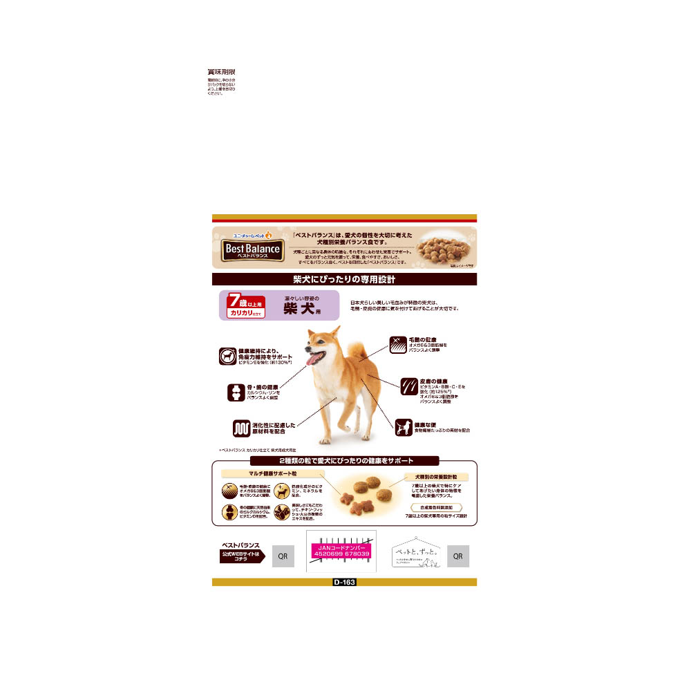 7歳以上の柴犬に合わせた専用設計。毛艶・皮膚の健康のためにオメガ6&3脂肪酸をバランスよく調整。皮膚の健康のためにビタミンA・B群・C・Eを強化。消化性に配慮した原材料を配合。骨・歯の健康のためにカルシウム・リンをバランスよく調整。ビタミンE強化で健康維持により免疫力維持をサポート。健康な便に配慮して食物繊維たっぷりの素材を配合。※ベストバランスカリカリ仕立て柴犬用成犬用比必要な栄養素は生物によって異なりますので、犬以外には与えないでください。まれに体調や体質にあわない場合もあります。何らかの異常に気付かれた場合は、給与を中断して早めに獣医師に相談することをおすすめします。天然素材を使用しておりますので、色・香りの違いや、形状、大きさ等のばらつきが見られることがありますが、品質に問題はありません。旨み成分が固まったり、粒等に付着してシミのように見える場合がありますが、品質に問題はありません。高温多湿や直射日光を避け、風通しの良い場所に保管してください。保管状態によっては、風味が落ちる場合がありますが、与えても差し支えありません。開封後は、ほこりや虫が入らないよう封をしっかり閉じて衛生的に保管し、早めに与えてください。食品、食器、おもちゃ、ペット用品等と区別し、小児の手の届かない場所に保管してください。本品の空き袋をおもちゃにしないでください。