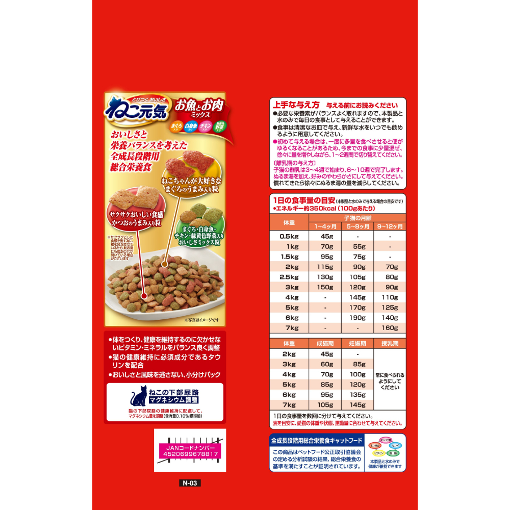 サクサクおいしい食感のかつおだし入り粒とまぐろのうまみ入り粒が入ってとびつくおいしさ。おいしさと栄養バランスを考えた総合栄養食。体をつくり、健康を維持するのに欠かせないビタミン、ミネラルをバランス良く調整。まぐろ・白身魚・チキン・緑黄色野菜入り。