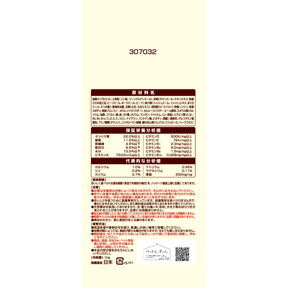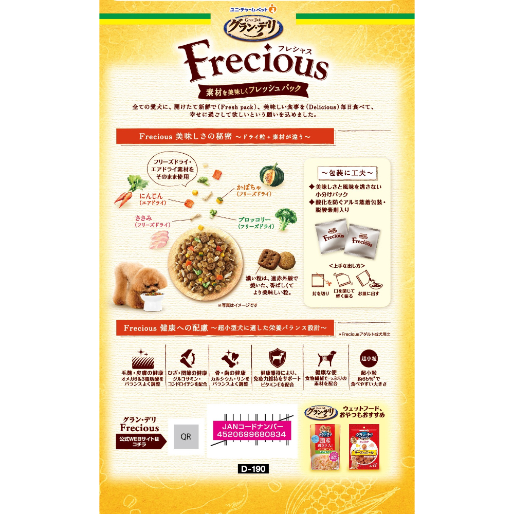 素材を美味しくフレッシュパックした国産プレミアムドッグフードです。遠赤外線で焼き上げた粒とフリーズドライ・エアドライの素材を、酸化を防ぐ鮮度維持包装をすることで、いつでも美味しくワンちゃんが喜びます。成犬向けの栄養バランスで、愛犬が大好きなチキン&ビーフ入りです。超小型犬向けなので、粒サイズがアダルト成犬用よりも小さく、またひざ・関節の健康維持の為にグルコサミン・コンドロイチンを配合しています。