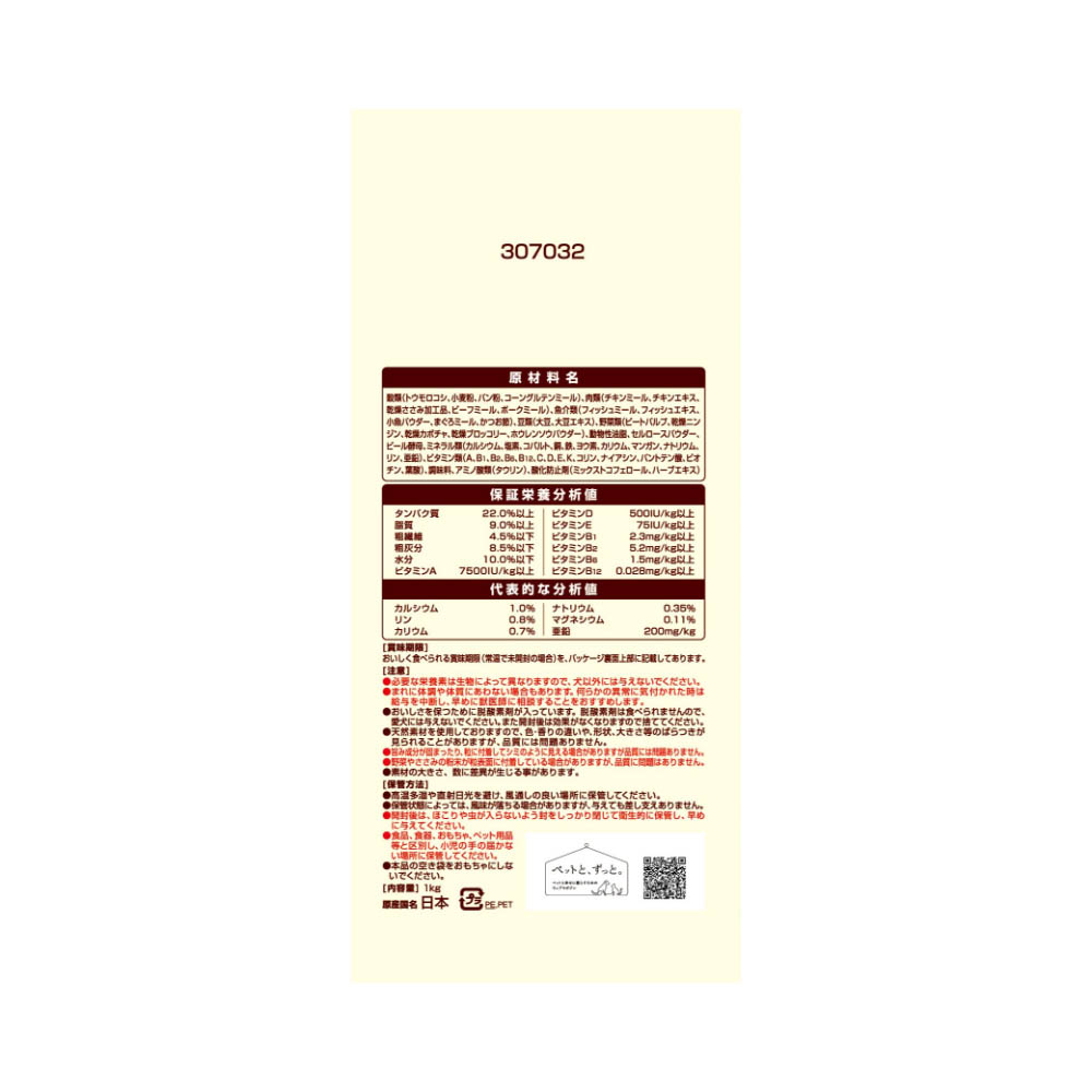 素材を美味しくフレッシュパックした国産プレミアムドッグフードです。遠赤外線で焼き上げた粒とフリーズドライ・エアドライの素材を、酸化を防ぐ鮮度維持包装をすることで、いつでも美味しくワンちゃんが喜びます。体重が気になる愛犬向けの低脂肪設計で、愛犬が大好きなチキン&小魚入りです。必要な栄養素は生物によって異なりますので、犬以外には与えないでください。まれに体調や体質にあわない場合もあります。何らかの異常に気付かれた時は給与を中断し、早めに獣医師に相談することをおすすめします。おいしさを保つために脱酸素剤が入っています。脱酸素剤は食べられませんので、愛犬には与えないでください。また開封後は効果がなくなりますので捨ててください。天然素材を使用しておりますので、色・香りの違いや、形状、大きさ等のばらつきが見られることがありますが、品質には問題ありません。旨み成分が固まったり、粒に付着してシミのように見える場合がありますが品質には問題ありません。野菜やささみの粉末が粒表面に付着している場合がありますが、品質に問題はありません。素材の大きさ、数に差異が生じる事があります。高温多湿や直射日光を避け、風通しの良い場所に保管してください。保管状態によっては、風味が落ちる場合がありますが、与えても差し支えありません。開封後は、ほこりや虫が入らないよう封をしっかり閉じて衛生的に保管し、早めに与えてください。食品、食器、おもちゃ、ペット用品等と区別し、小児の手の届かない場所に保管してください。本品の空き袋をおもちゃにしないでください。