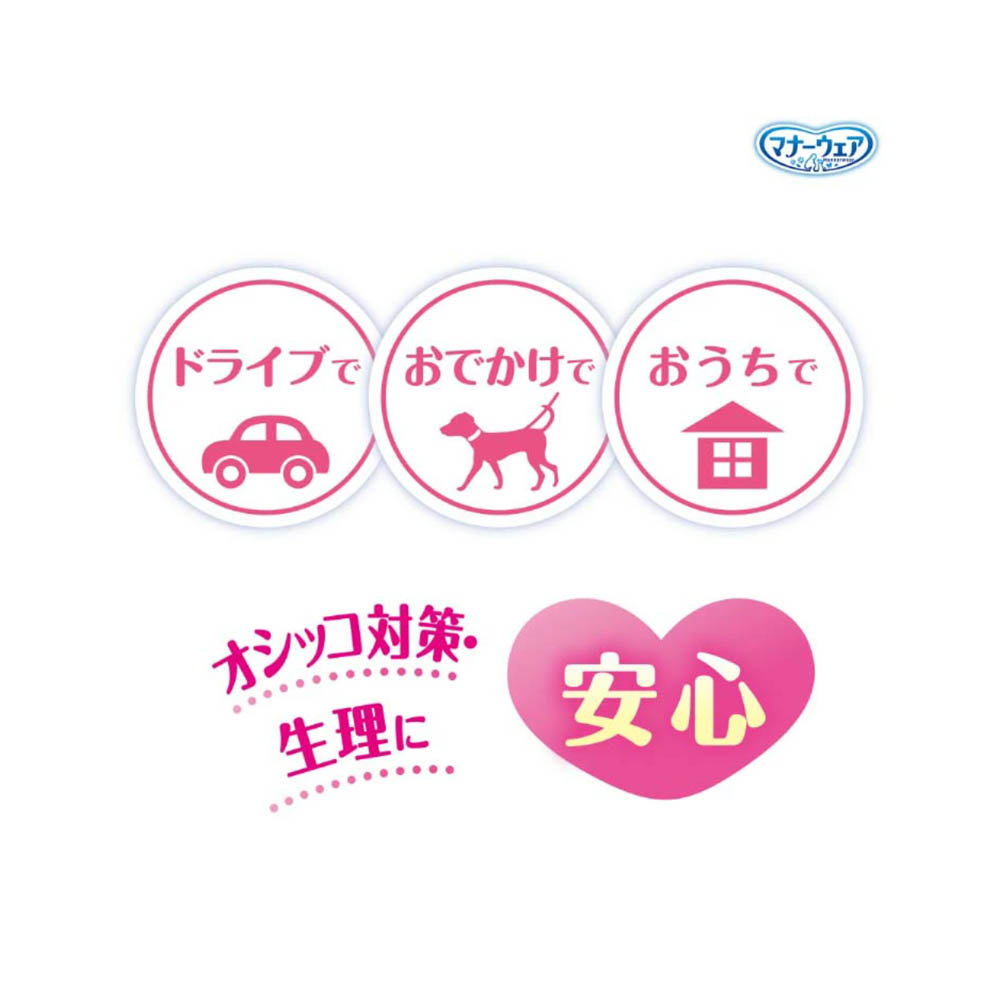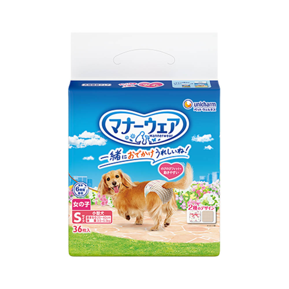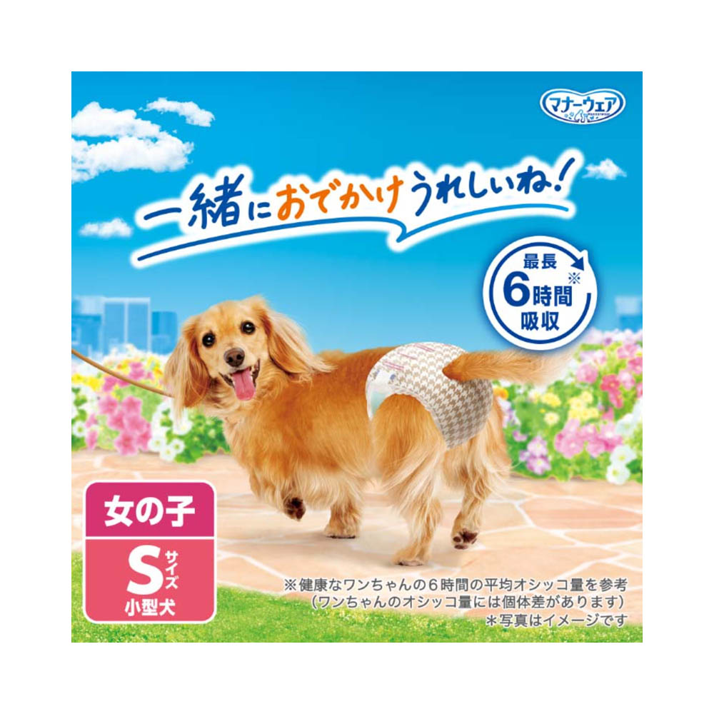 お出かけ・お部屋でのそそう・生理に安心!旅行、ドライブ、お散歩に。洋服感覚、2種のかわいいデザイン。「やわらかスリムフィット形状」で、嫌がらない。「やわらか全面通気シート」で、お肌さらさら。「ぴったりサイドギャザー」で、すきまモレ安心。安心スリム吸収体で、6時間分のおしっこを吸収。※健康なワンちゃんの6時間の平均おしっこ量を参考(ワンちゃんのおしっこ量には個体差があります)1.汚れたオムツは早くとりかえてください。2.テープは直接皮膚・被毛につけないでください。本品は高温多湿、火気付近を避け、直射日光の当たらない場所に保管してください。本品は開封後、ほこりや虫が入らないよう封をしっかり閉じて衛生的に保管してください。本品は食品、食器、おもちゃ、ペットフード等と区別し、小児の手の届かない場所に保管してください。本品の空き袋をおもちゃにしないでください。