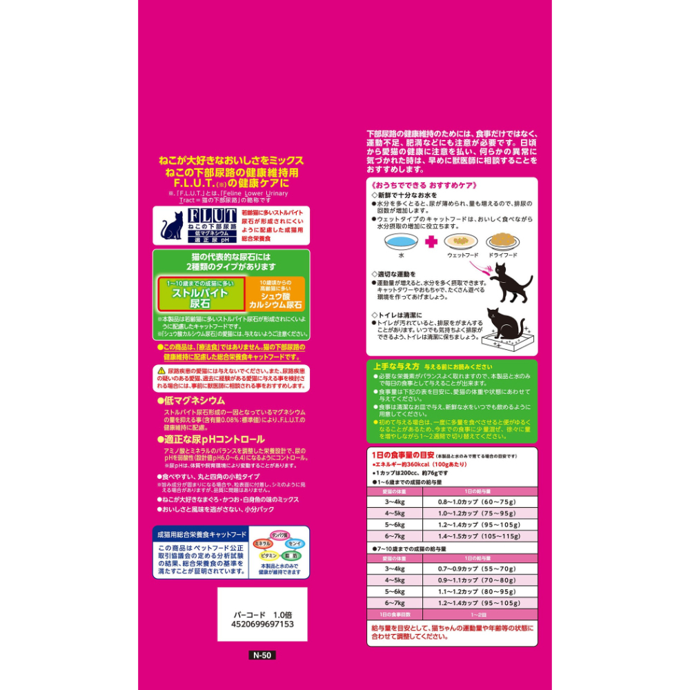 若齢猫に多いストルバイト尿石が形成されにくいように配慮。適正な尿pHコントロール:アミノ酸とミネラルのバランスを調整した栄養設計で、尿のpHを弱酸性(設計値pH6.0-6.4)になるようにコントロール。