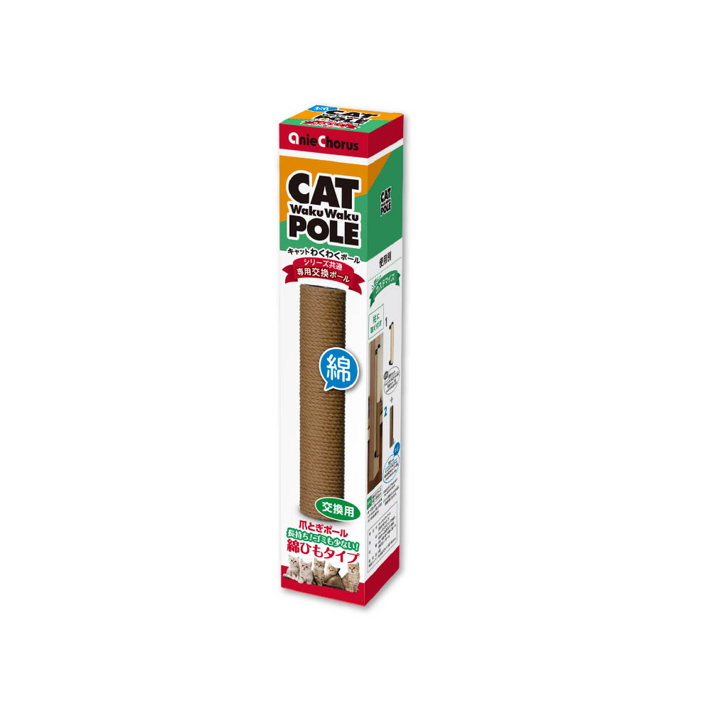 キャットわくわくポールシリーズの専用交換用ポールです。綿ひもタイプで新登場。ゴミも少なく長持ちします。連結ボルト1個、同梱していますので、追加購入で連結してロングタイプにもできます。麻ひもタイプとコンビネーションでも楽しめます。水分(湿気)でカビが発生する場合があります。水がかかった時はふき取り十分に乾燥させてください。