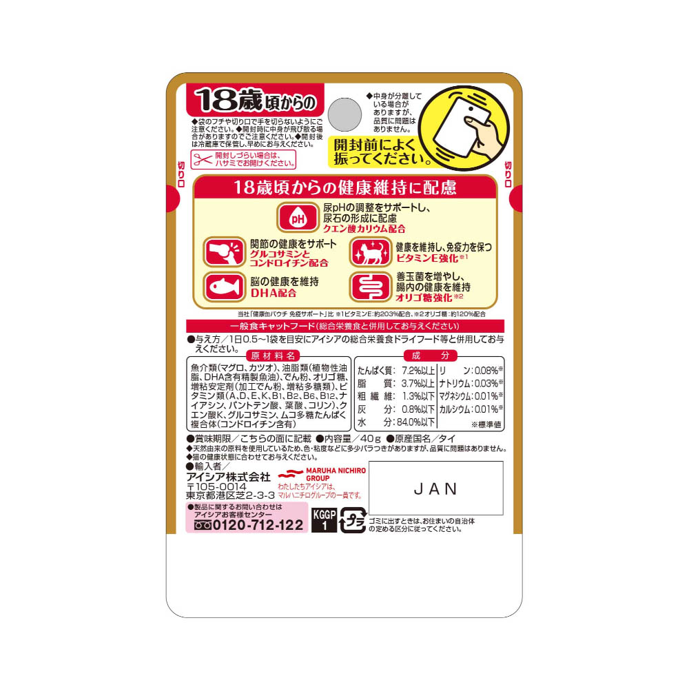 18歳からの長寿猫の免疫力を保つビタミンEを調整。関節の健康をサポートするコンドロイチン・グルコサミンと、脳の健康維持に配慮してDHAを配合。ペーストタイプ。袋のフチや切り口で手を切らないようにご注意ください。開封時に中身が飛び散る場合がありますのでご注意ください。直射日光・高温多湿の場所は避けて、保存してください。