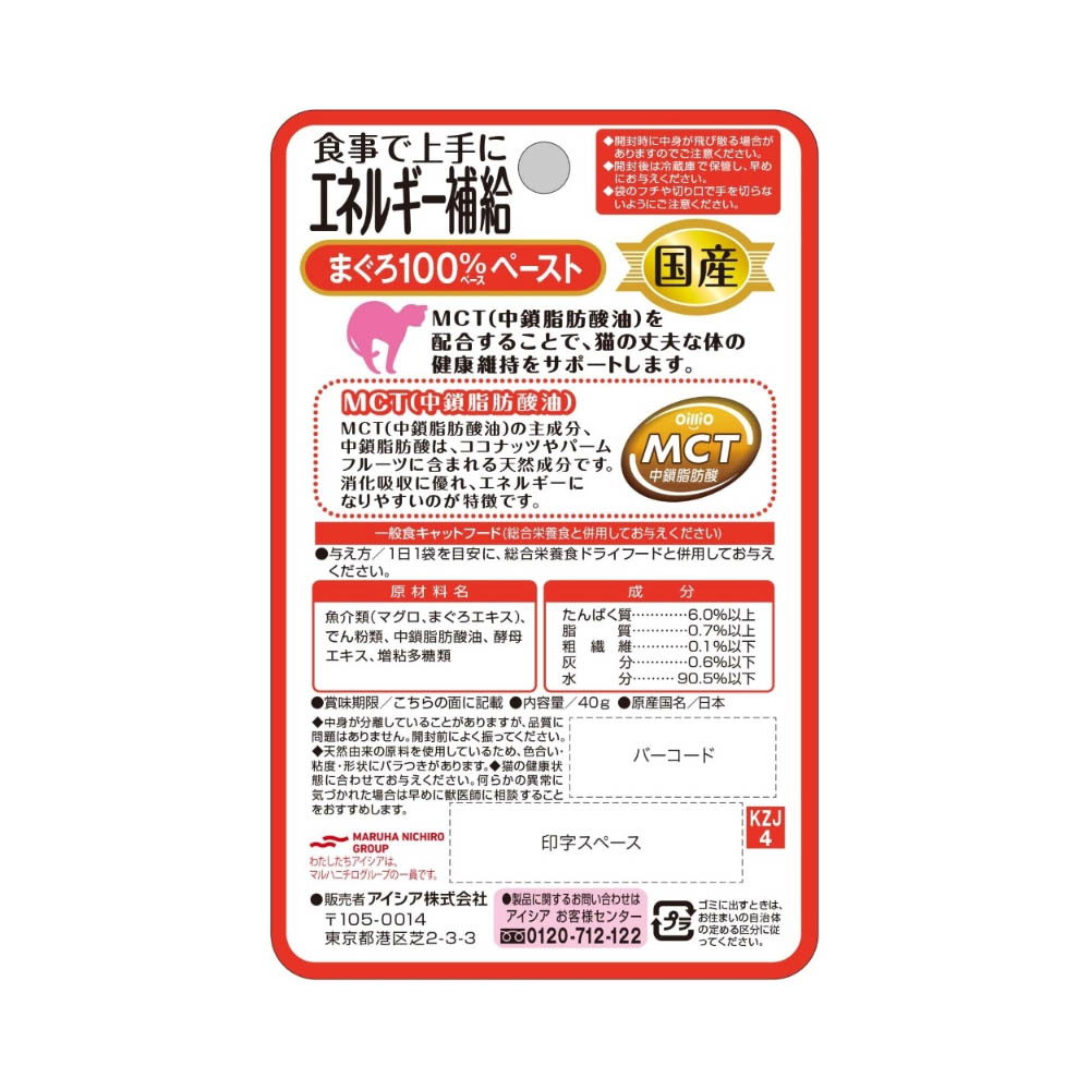 消化吸収に優れ、良質なエネルギーになりやすい中鎖脂肪酸油を配合。子猫からシニア猫まで食べやすいペーストタイプ。袋のフチや切り口で手を切らないようにご注意ください。開封時に中身が飛び散る場合がありますのでご注意ください。直射日光・高温多湿の場所は避けて、保存してください。
