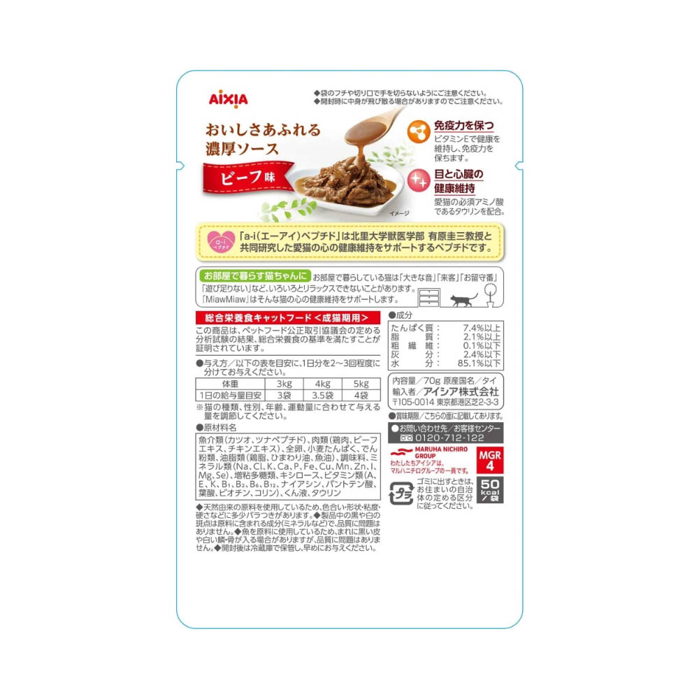 お魚とお肉のおいしさが詰まった素材を濃厚なグレービーソースでからめた総合栄養食。お部屋で暮らす愛猫の心の健康維持に配慮して「a-iペプチド」を配合。袋のフチや切り口で手を切らないようにご注意ください。開封時に中身が飛び散る場合がありますのでご注意ください。直射日光・高温多湿の場所は避けて、保存してください。
