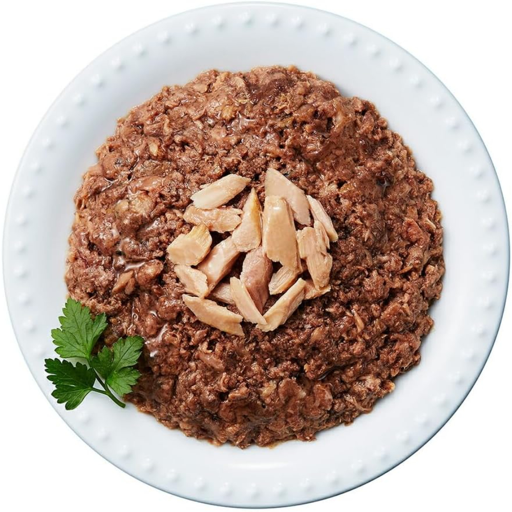 DHA、EPA、鉄分、タウリン、ビタミンEを含むかつおの赤身肉に、かつおの白身肉をトッピングした総合栄養食。おいしさにこだわった旨味エキス配合。