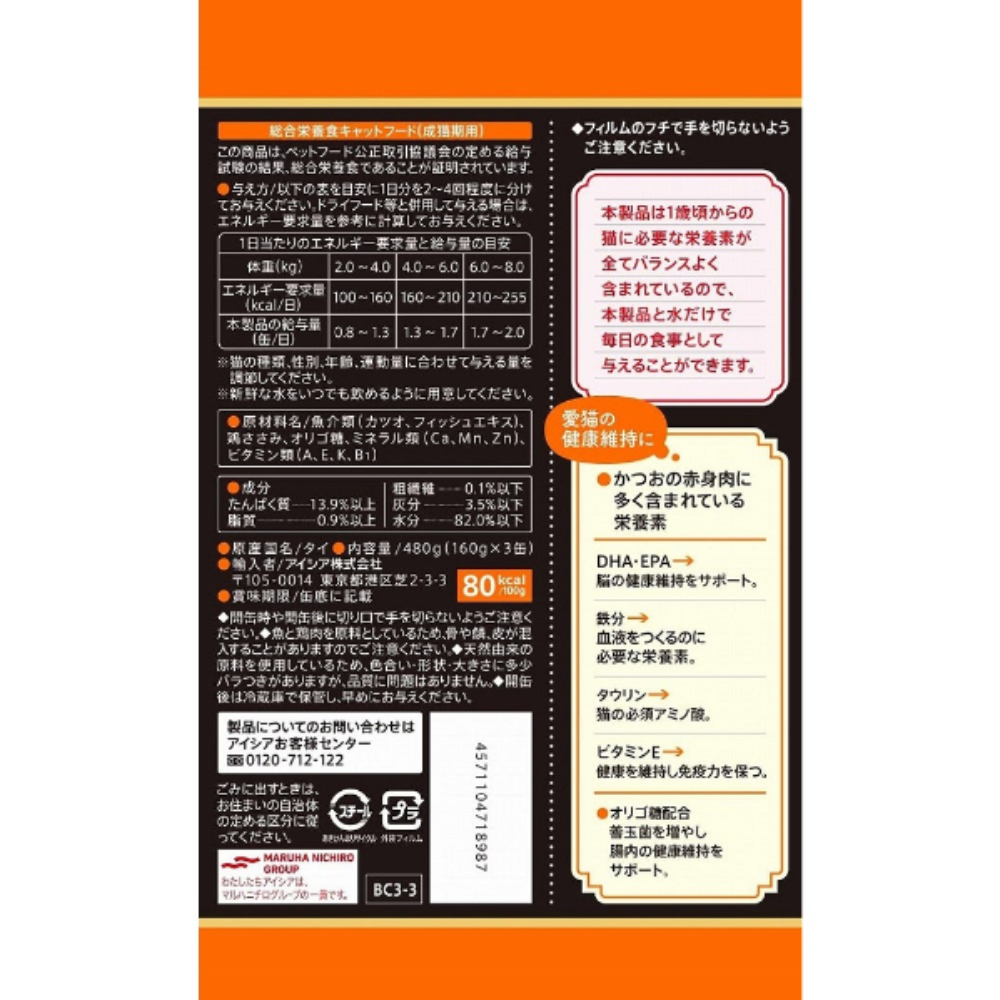 DHA、EPA、鉄分、タウリン、ビタミンEを含むかつおの赤身肉に、人気の具材をトッピングした総合栄養食。おいしさにこだわった旨味エキス配合。