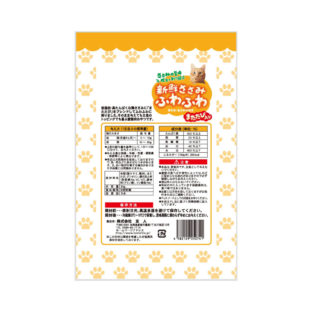 ササミにマタタビを練り込んで削った、ふわふわ食感の猫ちゃん用のおやつです。小麦粉も不使用です。体質や体調に合わない場合は、使用を中止し、獣医師にご相談ください。本品は間食用です。主食として与えないで下さい。愛猫の食べ方や習性によっては、喉に詰まらせるおそれがありますので、適切な大きさにしてお与え下さい。猫以外には与えないで下さい。包材の中に入っております脱酸素剤は、食べ物ではありません。品質には万全を期しておりますが、お気付きの点はご連絡下さい。ペットフードとしての用途をお守り下さい。本品はPL法に基づく保証保険に加入しています。