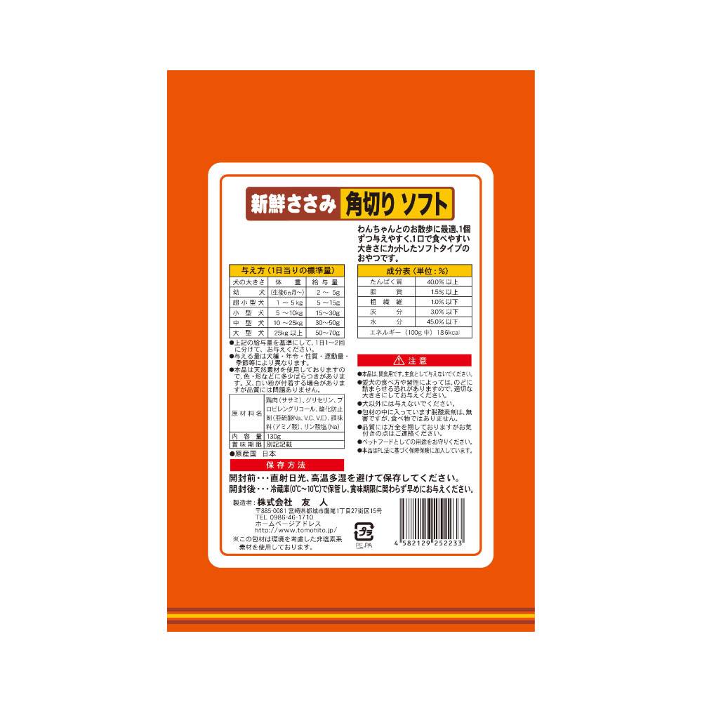 小麦粉等を使用しない、超低温で作り上げた、柔らかい角切りカットしたジャーキーです。体質や体調に合わない場合は、使用を中止し、獣医師にご相談ください。本品は間食用です。主食として与えないで下さい。愛犬の食べ方や習性によっては、喉に詰まらせるおそれがありますので、適切な大きさにしてお与え下さい。犬以外には与えないで下さい。包材の中に入っております脱酸素剤は、食べ物ではありません。品質には万全を期しておりますが、お気付きの点はご連絡下さい。ペットフードとしての用途をお守り下さい。本品はPL法に基づく保証保険に加入しています。