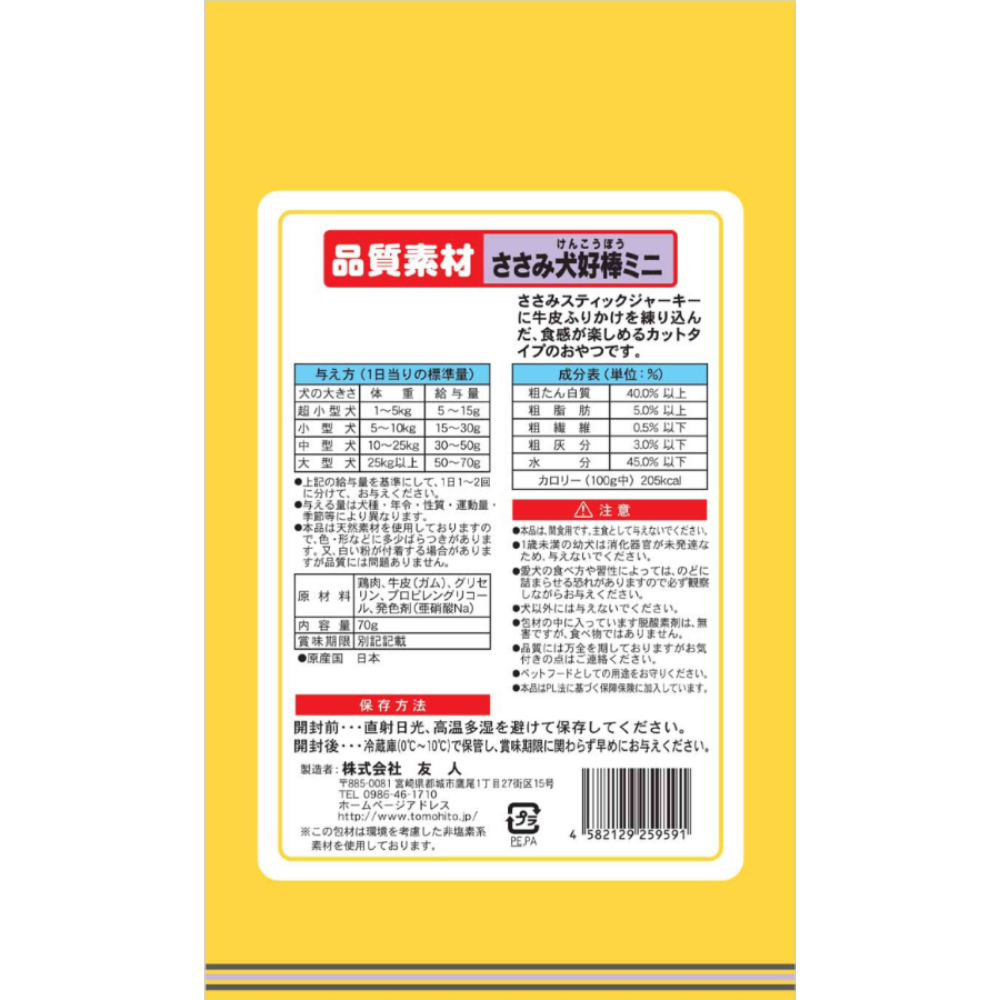 ささみスティックジャーキーに牛皮ふりかけを練り込んだ、食感が楽しめるカットタイプのおやつです。