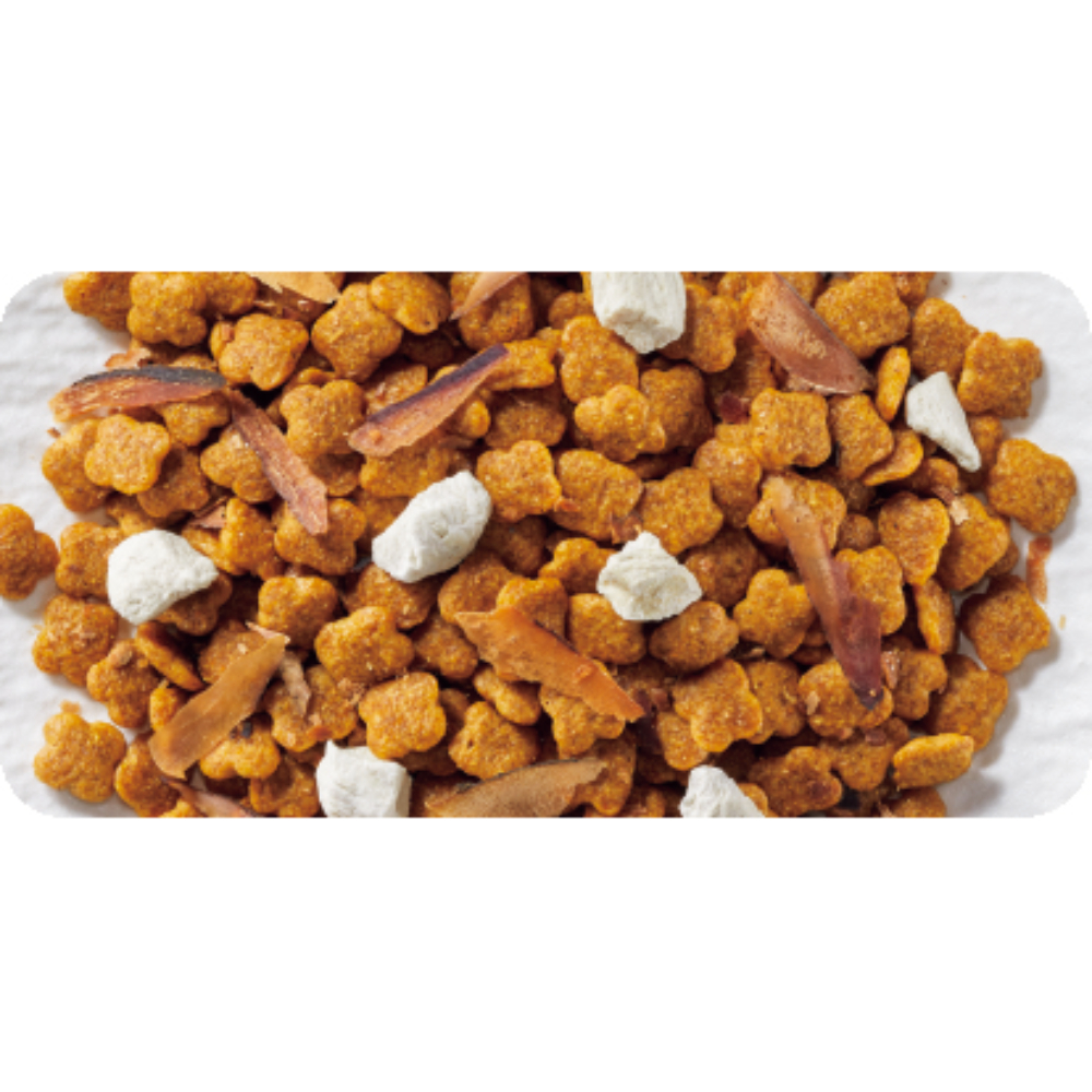 おいしいまぐろ味粒に国産鶏肉と減塩鰹節の本物素材。