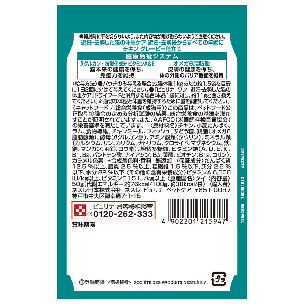 ピュリナワンキャット パウチ 避妊去勢した猫の体重ケア チキングレービー仕立て50g