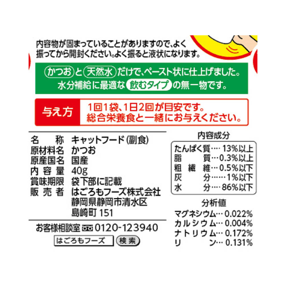 ペースト状にした素材と天然水を使用、白身肉のみを使用しています。飲むように食べれるため、水分補給に最適です。原料には個体差があるため、色合い・粘度、形状などにバラツキがあります。内容物が固まったり、水が分離していることがありますので、よく振ってから開封ください。よく振ると液状になります。また、加熱殺菌により内容物が膜状に固まる場合がありますが品質には問題ありません。