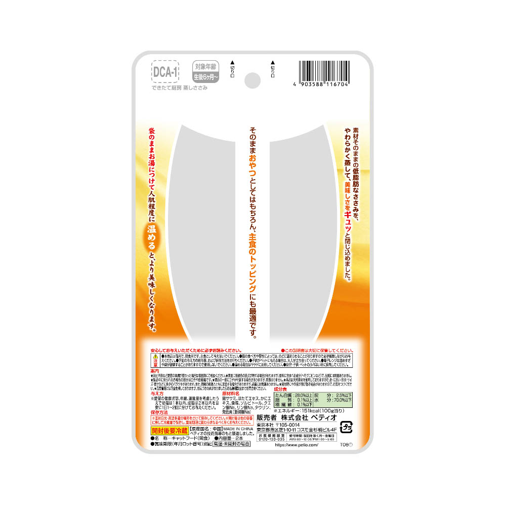 素材そのままの低脂肪なささみを、やわらかく蒸して美味しさをギュッと閉じ込めました。そのままおやつとしてはもちろん、主食のトッピングにも最適です。袋のままお湯につけて人肌程度に温めると、より美味しくなります。2つに分けて保存できる便利な2個分けパック。ほたてとかにの旨味エキス、タウリン配合。着色料不使用。本商品は猫用で、間食用です。主食として与えないでください。猫の食べ方や習性によっては、のどに詰まらせことがありますので必ず観察しながらお与えください。別記の与え方の給与量、および保存方法をお守りください。子供がペットに与える場合は、大人が立会ってください。電子レンジは温めすぎや袋が破裂することがありますので使用しないでください。温める場合はヤケドに注意してください。幼児子供ペットのふれない所に保管してください。