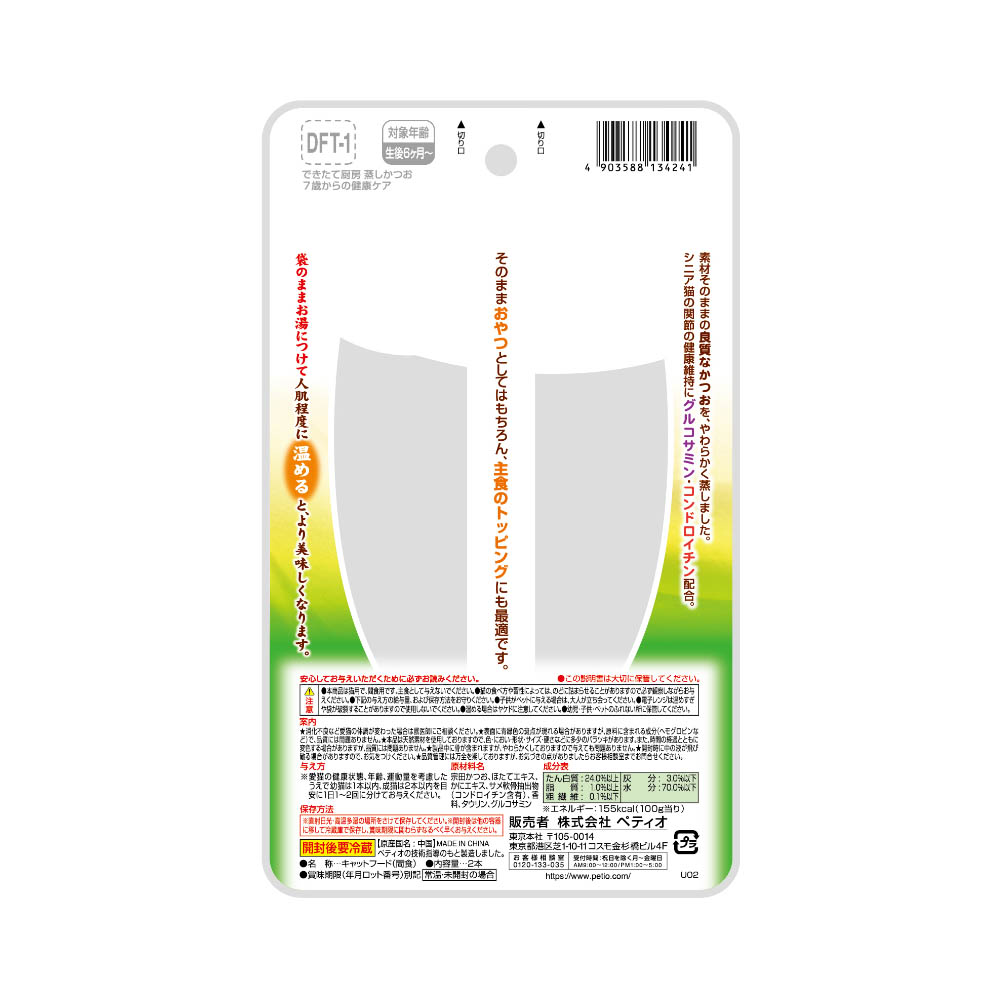 素材そのままの良質なかつおを、やわらかく蒸しました。シニア猫の関節の健康維持にグルコサミンコンドロイチン配合。そのままおやつとしてはもちろん、主食のトッピングにも最適です。袋のままお湯につけて人肌程度に温めると、より美味しくなります。便利な2個分けパック。ほたてとかにの旨味エキス入り、タウリン配合。着色料不使用。体質や体調に合わない場合は、使用を中止し、獣医師にご相談ください。本商品は猫用で、間食用です。主食として与えないでください。猫の食べ方や習性によっては、のどに詰まらせることがありますので必ず観察しながらお与えください。別記の与え方の給与量、および保存方法をお守りください。子供がペットに与える場合は、大人が立ち会ってください。電子レンジは温めすぎや袋が破裂することがありますので使用しないでください。温める場合はヤケドに注意してください。幼児子供ペットのふれない所に保管してください。